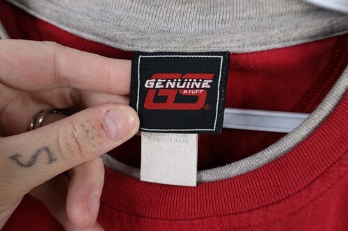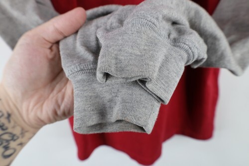 Blemish front bottom, cuffs. Pilled. Graphics distressed. Color fade. Collar discolored