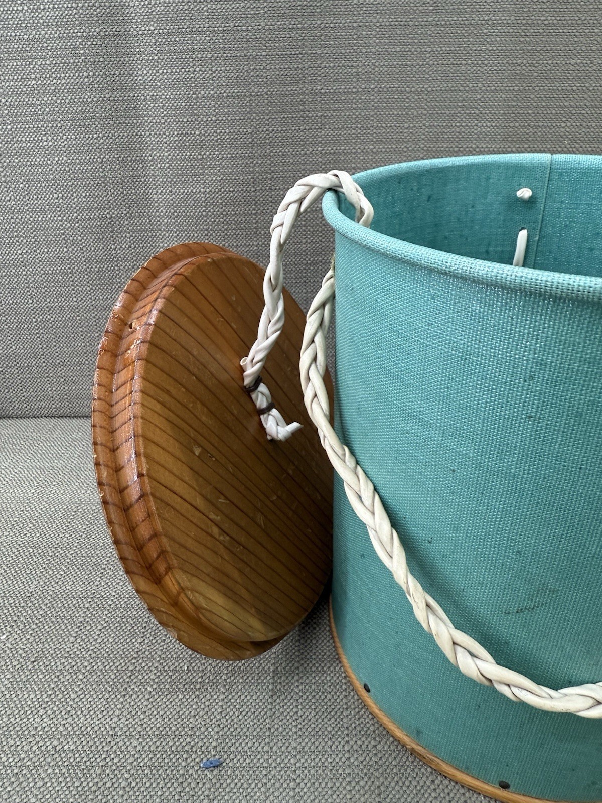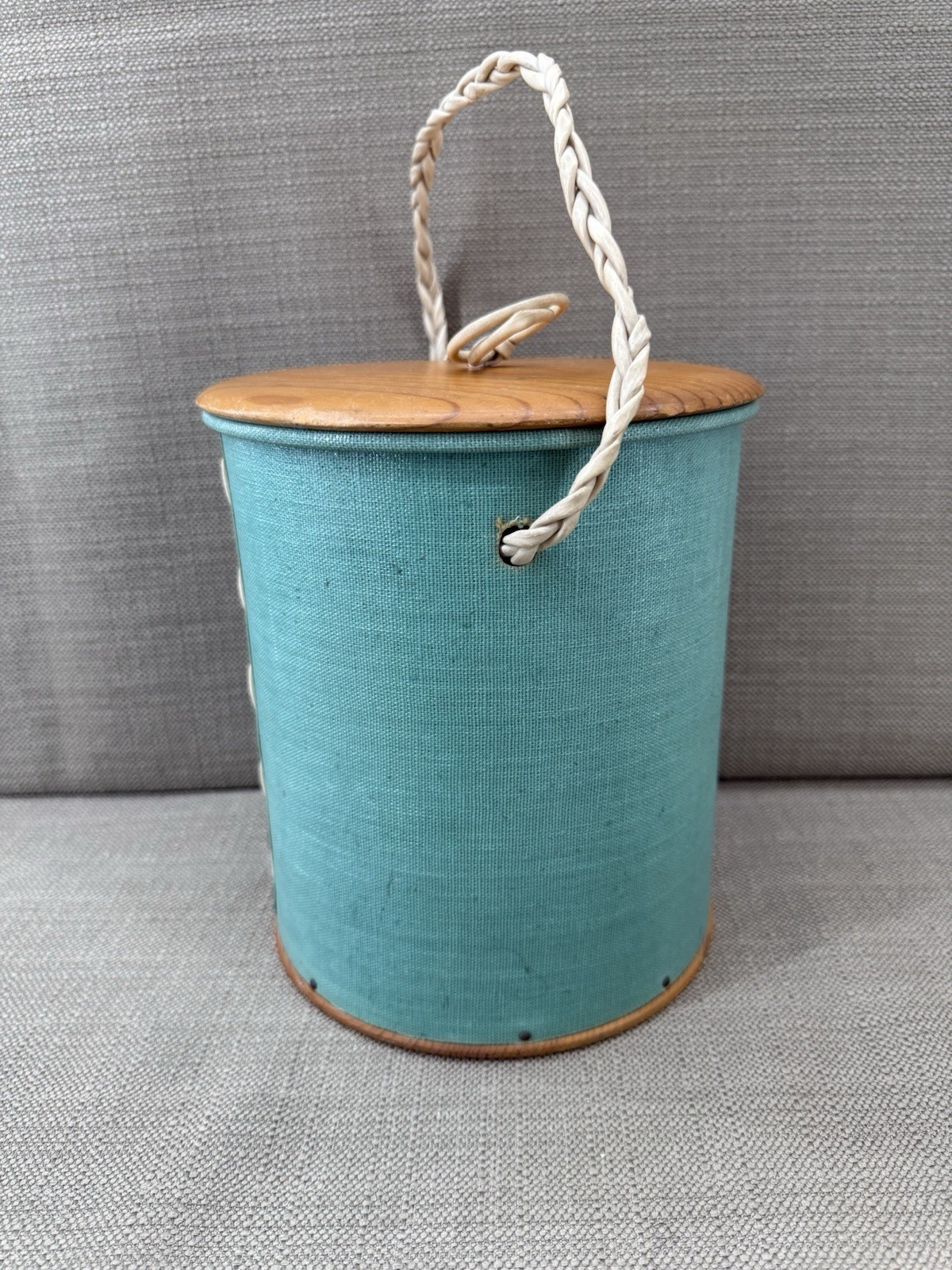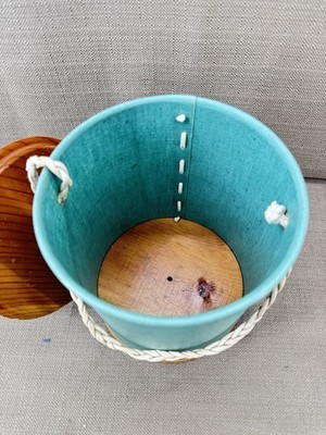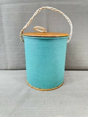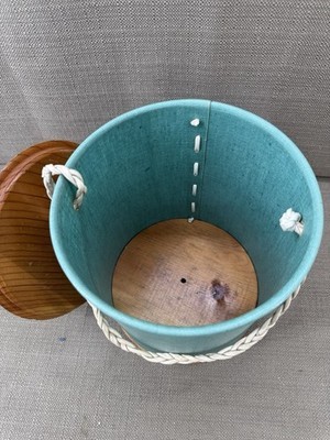 Vintage Yarn Holder Knitting Canister Green Fabric Wood Lid Handle Sewing Storage. This charming vintage yarn holder features a sturdy wooden base, attached wood lid, and braided carry handle, perfect for keeping your knitting, crochet, or sewing supplies organized. Its unique retro design makes it both functional and collectible. Add to your craft room storage or gift to a vintage sewing enthusiast.