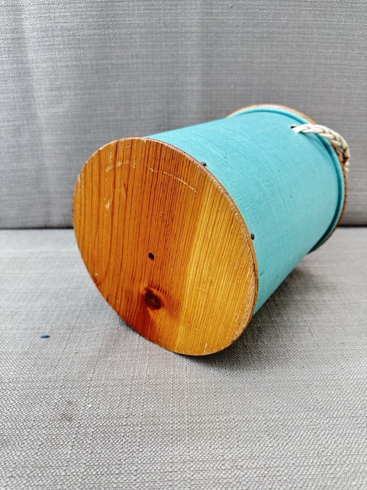 3160. Vintage Yarn Holder Knitting round Canister Green Fabric Wood Lid Handle Sewing Storage