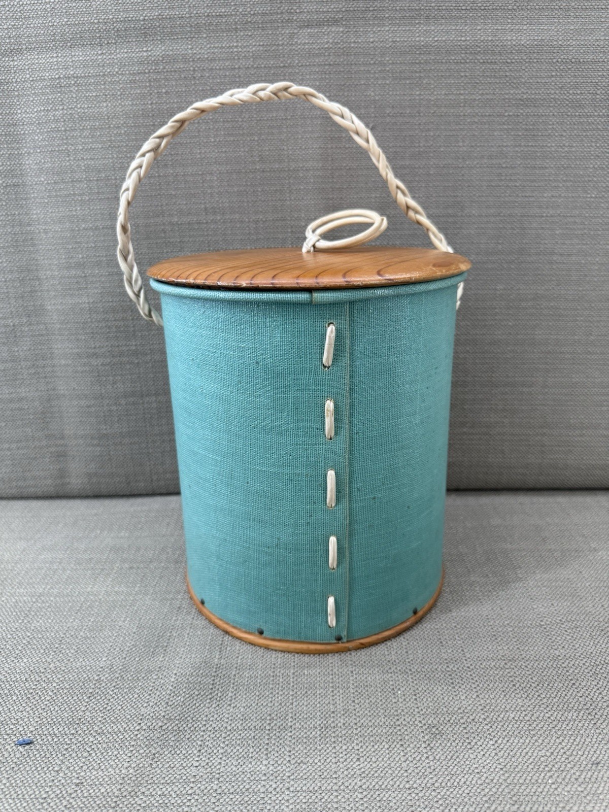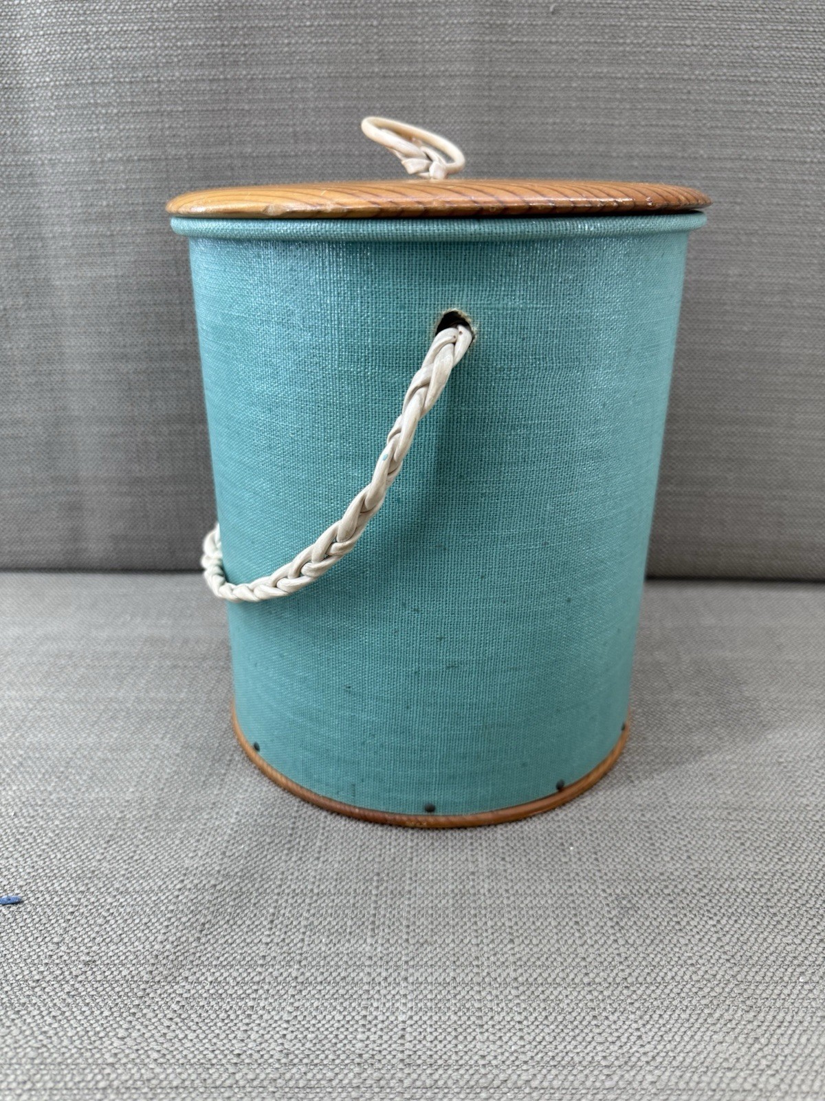 - Vtg Yarn Holder Knitting Canister Green Fabric Wood Lid Handle Sewing Storage