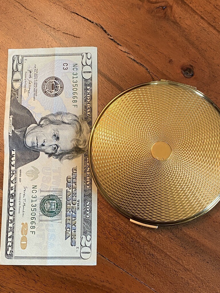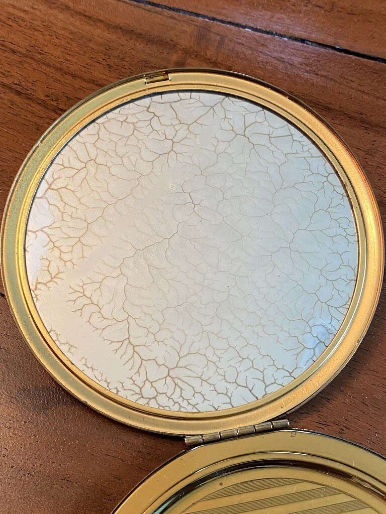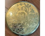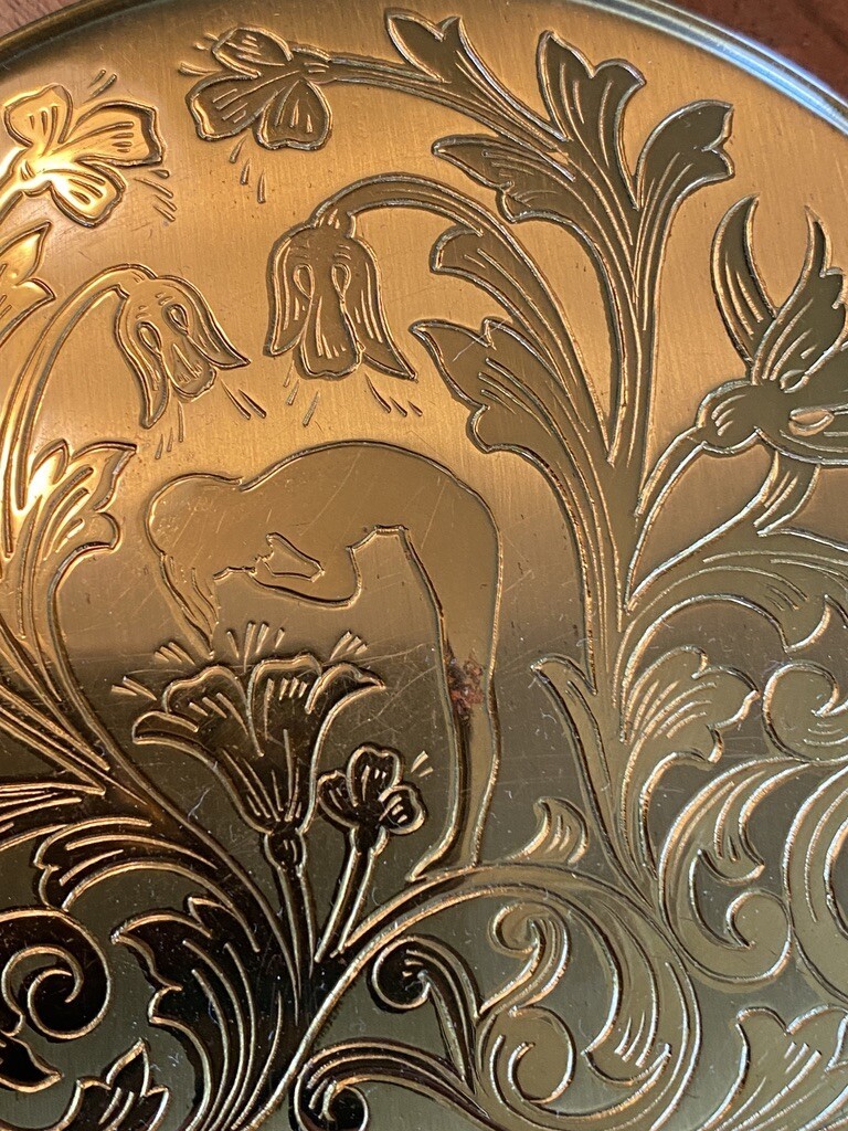 - Vtg Zell Brass Purse Compact NEVER USED Nude Sprite Fancy Floral 4" w/box