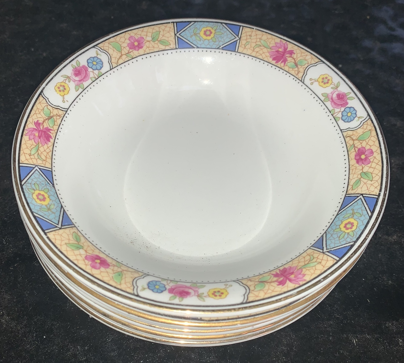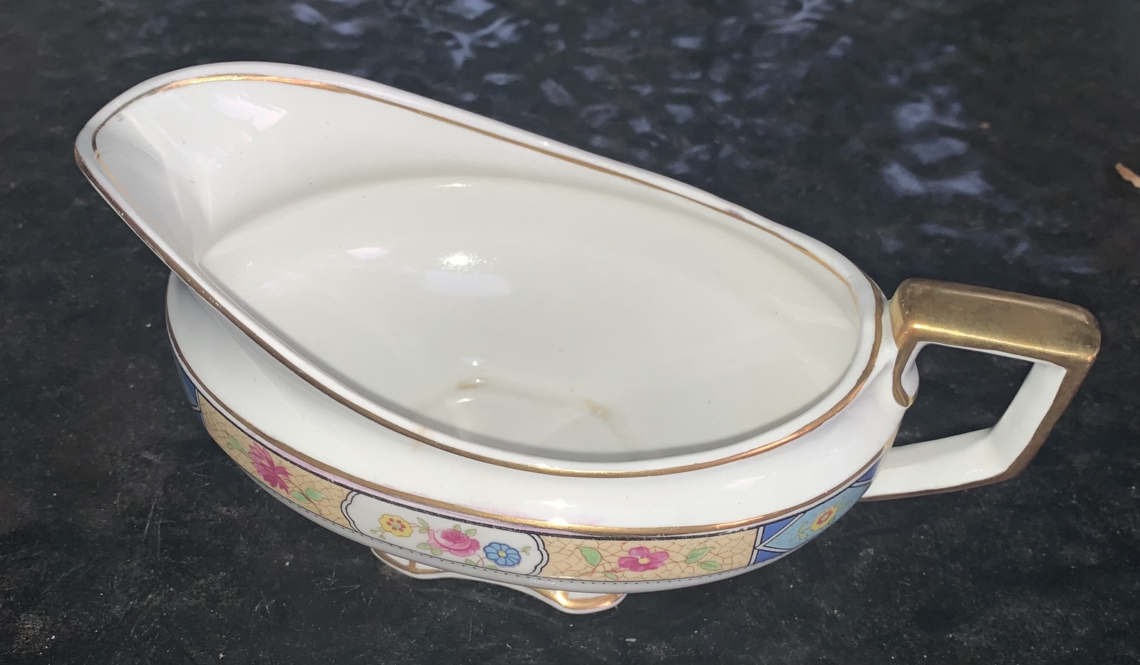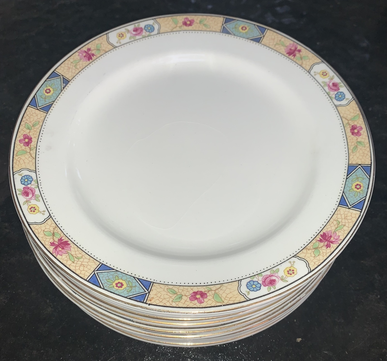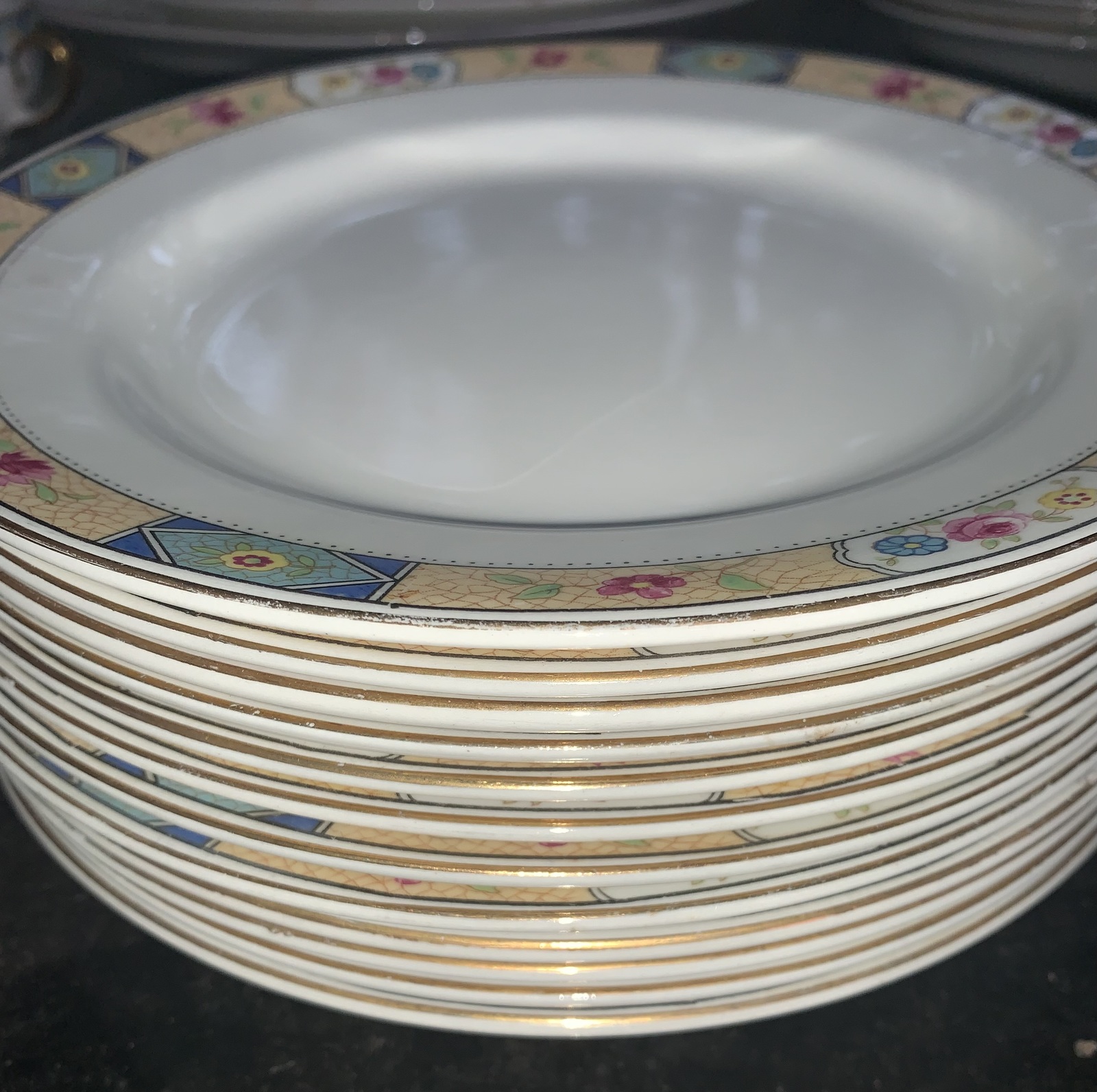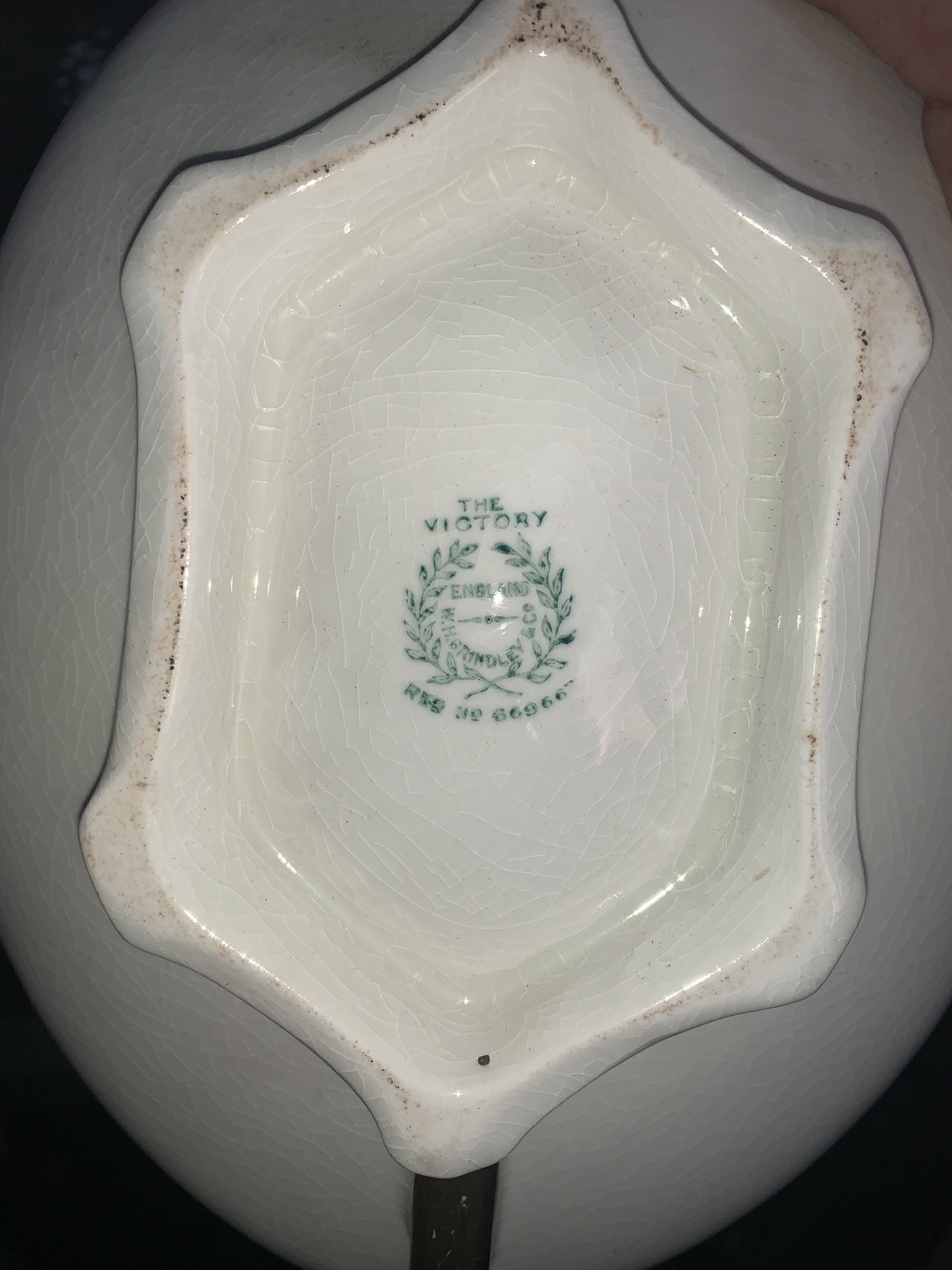 This exquisite 46-piece china set by W.H. Grindley Co. features the rare “The Victory” pattern, registered in England circa 1911. Crafted from semi-porcelain and adorned with 22-karat gold trim, each piece showcases a striking geometric floral motif in alternating pastel panels—white, yellow, and blue—each containing delicate flower illustrations. The set includes a full dinner service with rare serving pieces: • 12 dinner plates • 12 soup/serving bowls • 7 teacups • 6 saucers • 4 oval platters (Large, Medium, Small, Deep Dish Small) • 1 gravy boat • 2 covered serving dishes (1 large oval, 1 medium round) Condition: Very good vintage condition. Minor crazing on select pieces, one chipped teacup with discoloration, and one stained saucer. Gold trim remains intact across all handles, rims, and knobs. Highlights: • Rare geometric floral design • Matching pattern across all pieces • Covered serving dishes with ornate grab-point knobs • Ideal for collectors, decorators, or formal vintage dining Historical Context: This set was produced during the Edwardian era, reflecting the transition into early Art Deco design. The registration number places it firmly in the early 1910s. The geometric floral motif is less common among Grindley’s catalog, making this set particularly desirable for collectors seeking unique patterns with intact gold detailing. Collector Notes: Covered serving dishes are often misidentified as tureens; however, these feature grab-point knobs without ladle cutouts, confirming their use for vegetables or dry service. The consistent pattern across all pieces and inclusion of rare serving ware enhances both display and functional value. Shipping: Carefully packed and insured. Shipped via USPS, UPS or FedEx. This is a large, fragile and heavy item that needs to be carefully wrapped with extra padding. Weight will be close to 50 pounds in a large box. Shipping fee reflects the cost shippers charge for such an item. Maker: W.H. Grindley Co., Staffordshire, England Pattern Name: The Victory Registration Number: 669667 (circa 1911–1912) Material: Semi-porcelain with 22-karat gold trim Design: Geometric floral motif featuring alternating pastel rectangles (white, yellow, blue) with internal flower illustrations. Gold accents on rims, handles, and knobs. Backstamp: Green wreath with “THE VICTORY” and “ENGLAND W.H. GRINDLEY CO. REG No 669667”