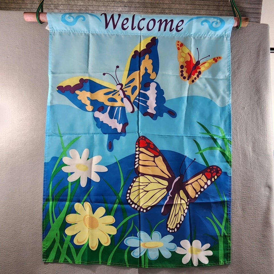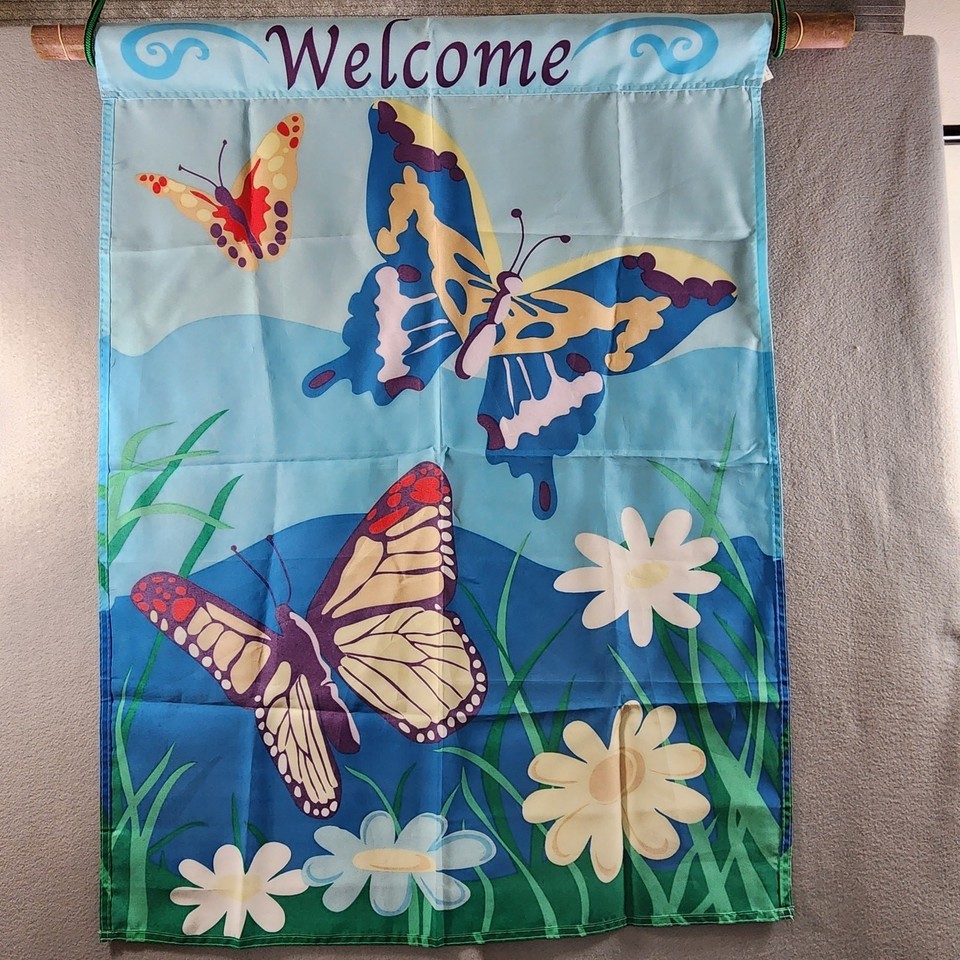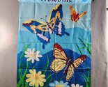 WELCOME Butterflies Floral Garden Flag Banner Double Sided Fabric Yard 29x39 By New Creative Enterprises 2005 100% Polyester Preowned. Does have some Stains as seen in the photos