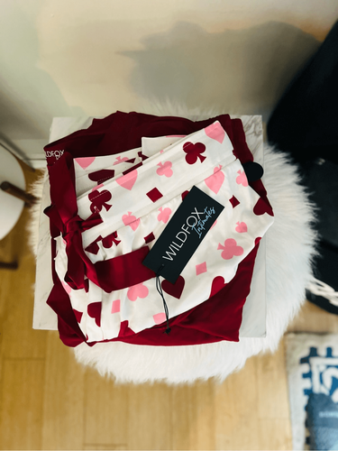 WILDFOX Love's a Gamble Shorty Pajamas Set Color: Red Hearts Size: Large NEW WITH TAGS ATTACHED Love's a gamble but your sleep doesn't have to be - so have a restful slumber in this ultra-soft and comfortable shorty pajama set. Shirt features jewel neck, long sleeves, graphic front Shorts feature elastic drawstring waist, all-over print 95% polyester, 5% spandex Machine wash cold, tumble dry low Imported