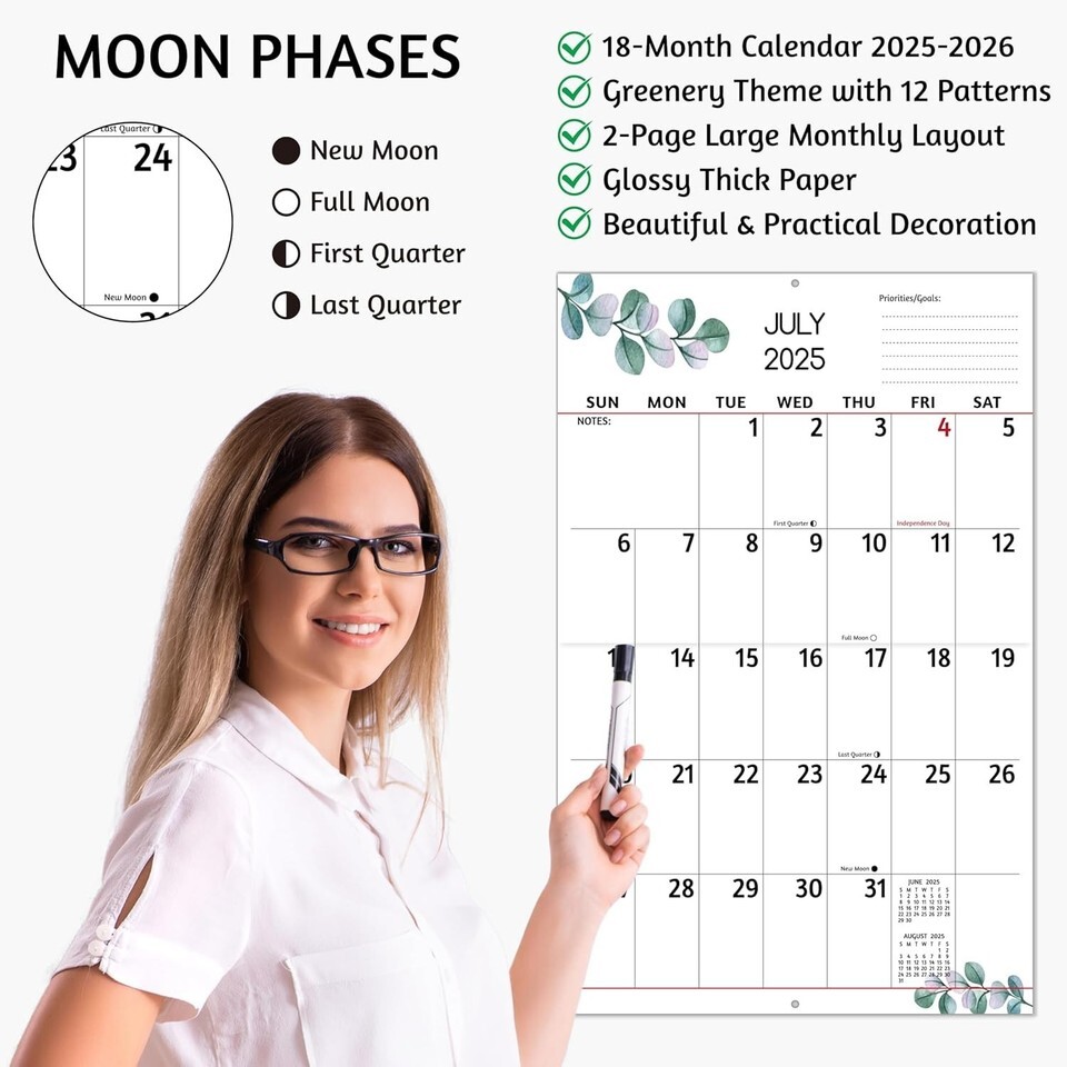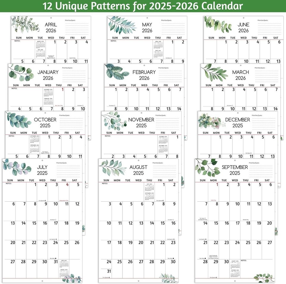 ? This wall calendars 2025-2026 has 12 different green leaf patterns, clearly printed on glossy smooth paper, very beautiful and vivid. Plus, each month there are 4 main moon phase marked, very useful.