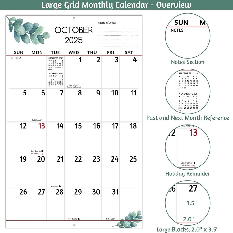 - The large wall calendar 2025-2026 features large print and big numbers that you can clearly see it from a long distance. Moreover, Large grid (2?? x 3.5??) gives you plenty of writing space for daily scheduling.