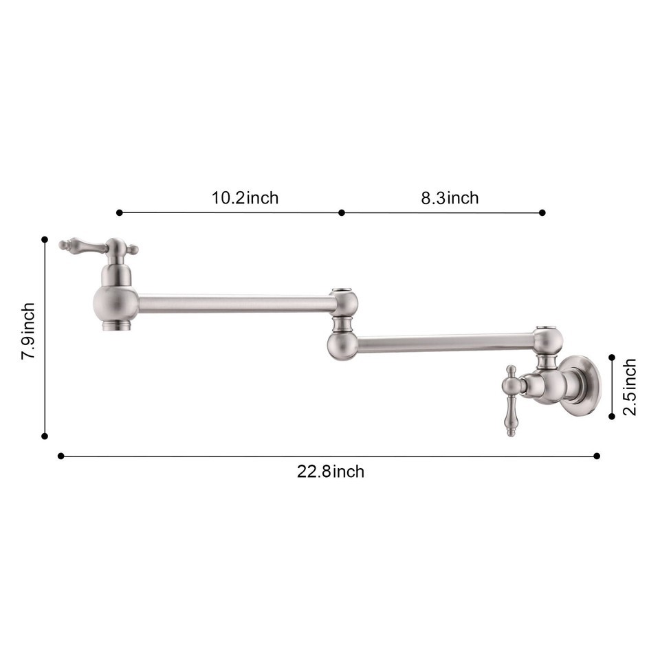 The wall-mounted pot filler faucet is not only beautiful but also practical. It has 360 rotation and folding functions, which can meet your cooking needs whether it is filling water or cleaning pots, and is foldable when not in use, saving kitchen space. The dual handles are simple to operate and provide easy on/off control to prevent dripping. The surface is specially treated to resist corrosion and not easily oxidized. Make your kitchen look cleaner and tidier.