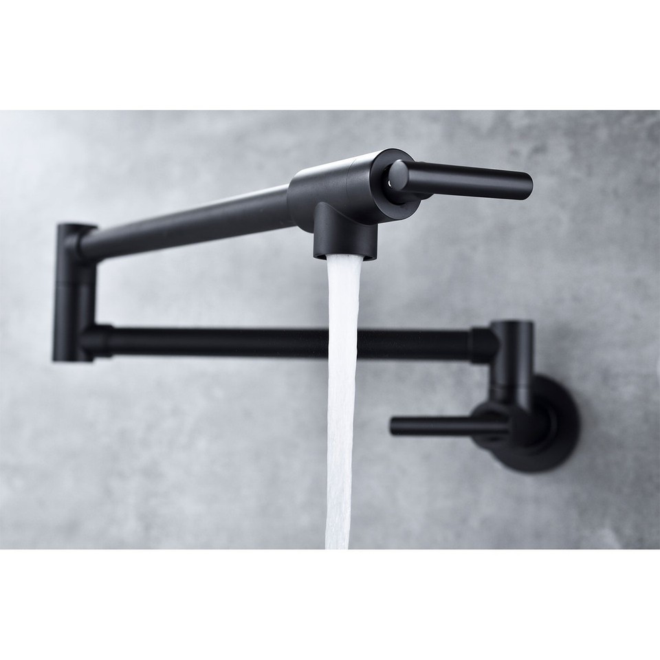 The pot filler faucet features a free-swivel arm design, making it easier to fill any pot on the stovetop and for easier cleaning. When not in use, the arms can be easily folded to save space.