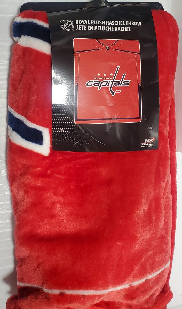 This is a 50" by 60" plush Washington Capitals Jersey design raschel throw blanket.