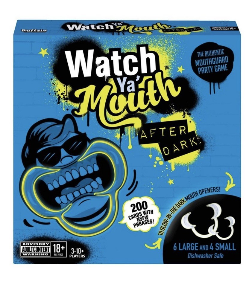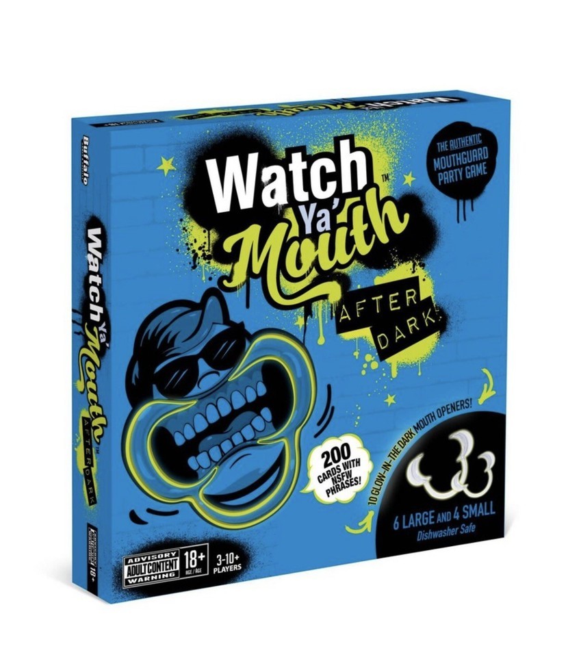 Watch Ya' Mouth After Dark Adult Party Game NSFW! (Not Suitable For Work) 200 Cards with Phrases 10 Glow in the Dark Mouth Openers (6 Large/4 Small) Dishwasher Safe 3-10 Players Adult Content For Ages 18+ The authentic hilarious mouthguard game! New in Sealed Box!