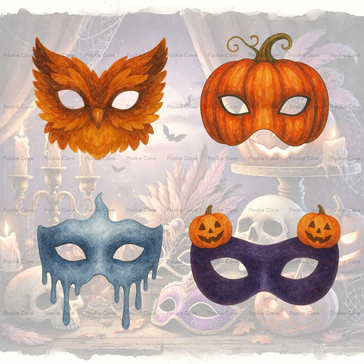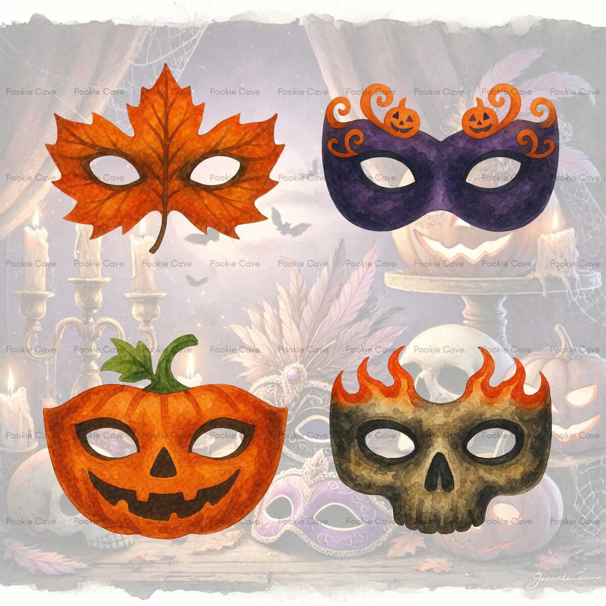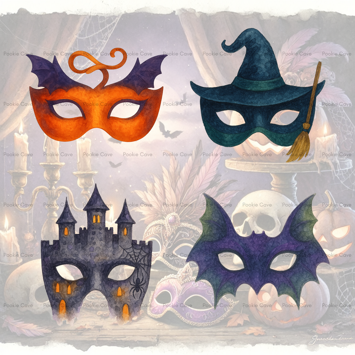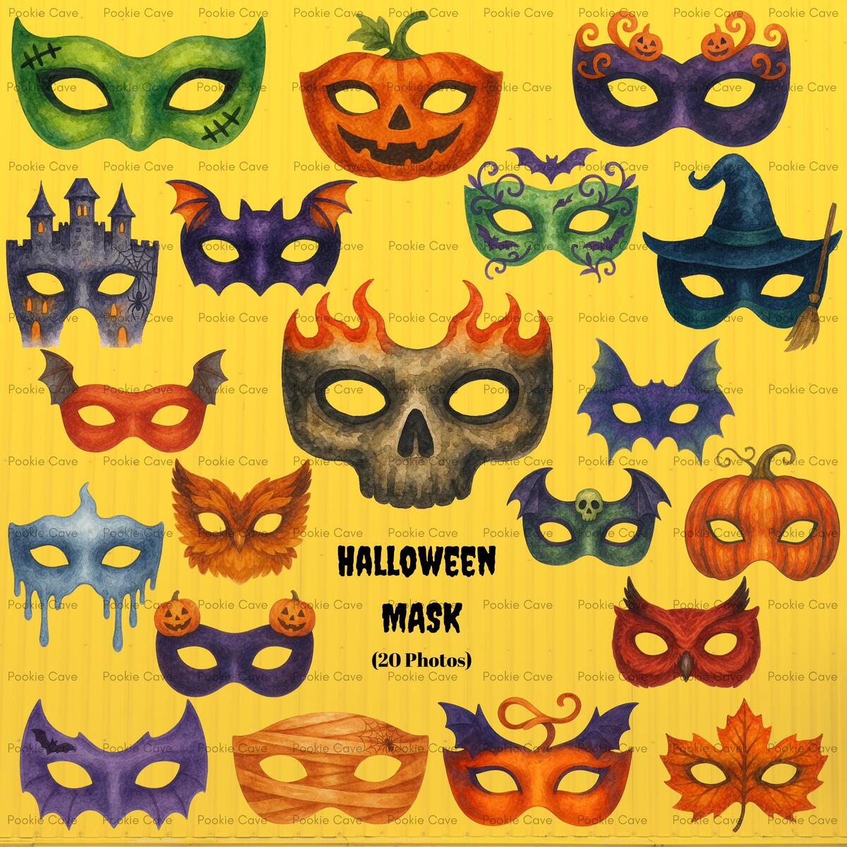 Watercolor Halloween Mask Clipart: 20 PNG Illustrations (Digital Download)