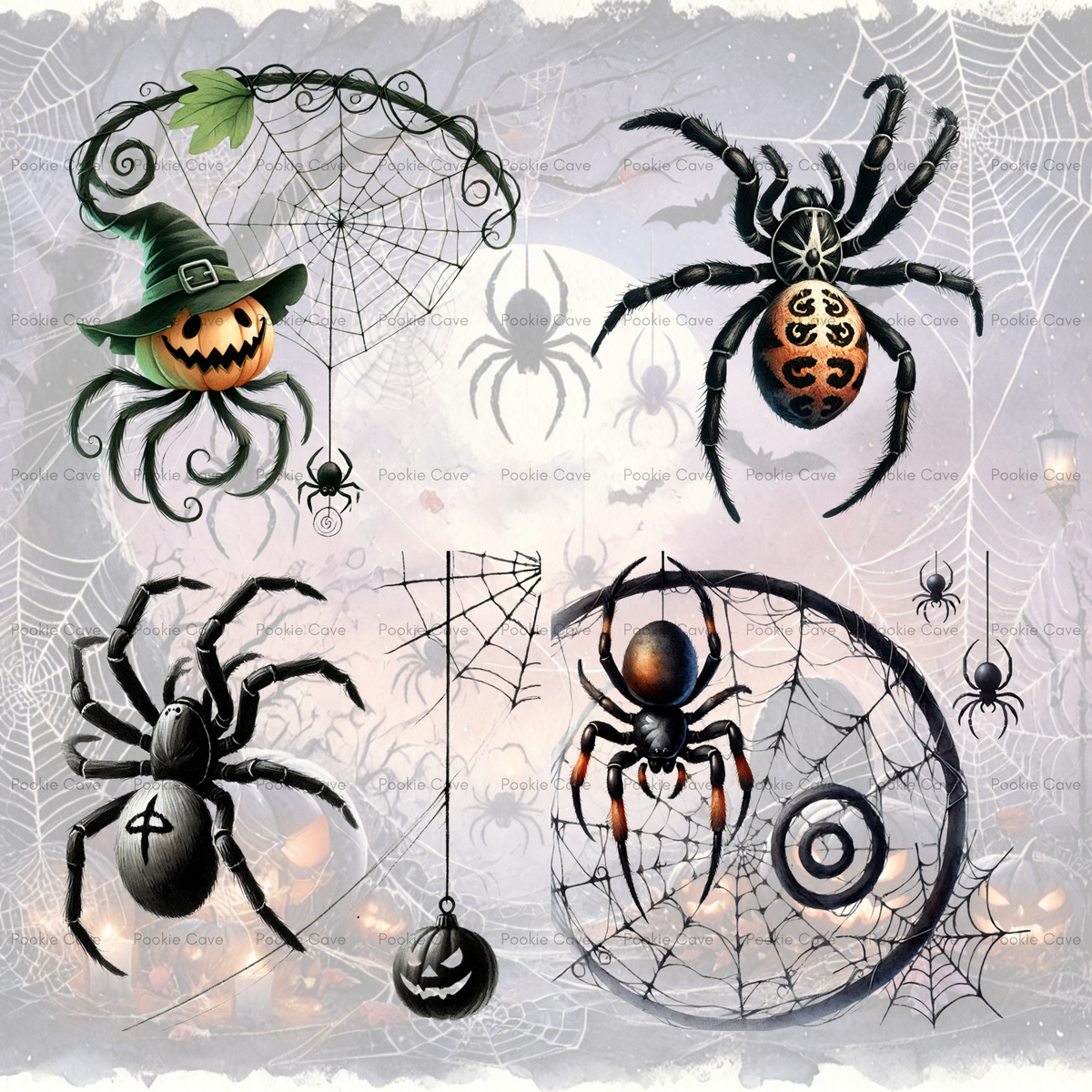 Creep into spooky season with this Halloween Spider Clipart Collection! Each spider is a soft watercolor style, detailed but playful, making it perfect for creepy-cute or gothic Halloween projects.
