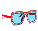 Red frames feature a faceted silver pattern that mimics rhinestones