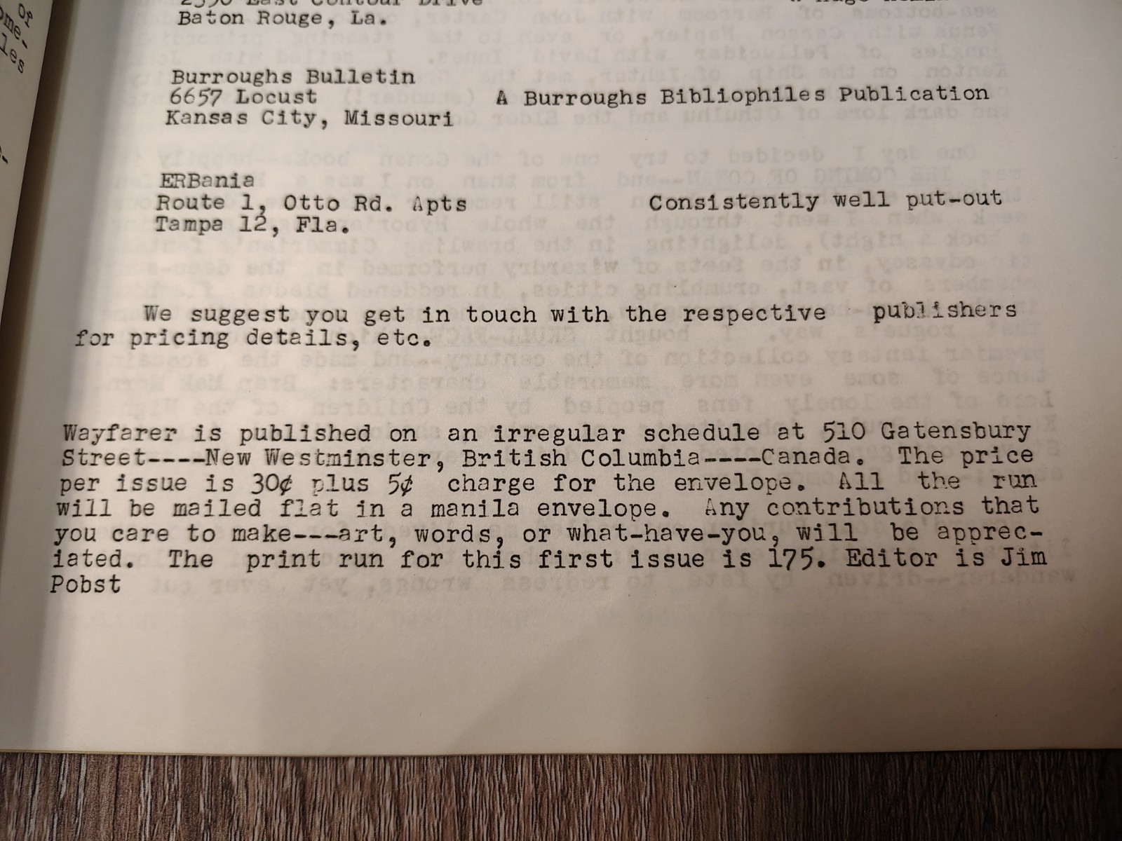 Wayfarer ? Vintage Fantasy/SF Fanzines -Lot of 2- # I and II - 1960s, ed. Jim Pobst Original mid-1960s fan-press fanzines from New Westminster, B.C., edited by Jim Pobst. Scholarly and enthusiast essays on Edgar Rice Burroughs (ERB), H. P. Lovecraft (HPL), and Robert E. Howard (REH), including a contribution by noted Howard scholar Glenn Lord. Not a chapbook?these are multi-contributor, staple-bound fanzines. What?s Included Wayfarer Vol. 1 No. 1 (c. 1966) Contents (selected): John Pocsik ?The Blue Flame of Vengeance?; L. Banning ?Dementia?; R. Hebert ?Creator Creation?; L. Yacuk ?The Predecessors?; Tom Grady ?Review of the ERB Style and Revival?; Ronn Smith ?HPL?Revisited?; Garry Burg ?London and Howard?. Art: interior illustrations credited to Arthur Hook. Cover art uncredited. Wayfarer II (1966) Colophon: price 30 (+5 envelope); print run 100 copies; 510 Gatensbury St., New Westminster, B.C. Contents (selected): John F. Roy ?The Many Tongues of Pellucidar?; Garry Burg ?Kathulos vs. Fu Manchu? and ?The Arena?; Glenn Lord ?The Mystery Titles of Robert E. Howard?; R. Frazer ?A Guide to the Avon Fantasy Reader?; ?Books of Interest.? Cover is primarily typographic/plain. Condition General: staple-bound mimeo/ditto fanzines with typical 1960s age toning and light handling. Vol. 1 No. 1: light edge wear; tiny corner bumps; small red pencil notation (?ERB article?) at top right; mild staple oxidation. Top Staple loose Wayfarer II: mild cover handling/crease; staples on the back cover are barely holding the cover on; clean interiors. Please review all photos for exact condition?images are part of the description. Publication Details Editor: Jim Pobst Place: New Westminster, British Columbia, Canada Format: Fanzine (staple-bound; small-press/mimeo) Language: English Era: 1966 run Notes Fanzine, not a chapbook; multi-contributor periodical with ToC and editorial matter. Excellent research interest for ERB/Barsoom Pellucidar, HPL/Weird Fiction, and REH/Conan scholarship. We will do our best to "Hulk-Proof" your package! We are not lazy sellers who throw your book in a mailer and call it good! Thanks for looking at our listing and supporting our small family business! Please take a look at our other listings of Prints, Comics, Supplies, statues and collectibles! We would be more than happy to combine shipping for you if possible! SHELF: D.O. (Shortbox 3) wayfarer fanzine 1960s jim pobst canadian fanpress mimeograph ditto small press edgar rice burroughs erb john carter barsoom pellucidar h p lovecraft hpl weird fiction robert e howard reh conan glenn lord avon fantasy reader bibliography pulp studies science fiction fantasy fanzines rare scarce
