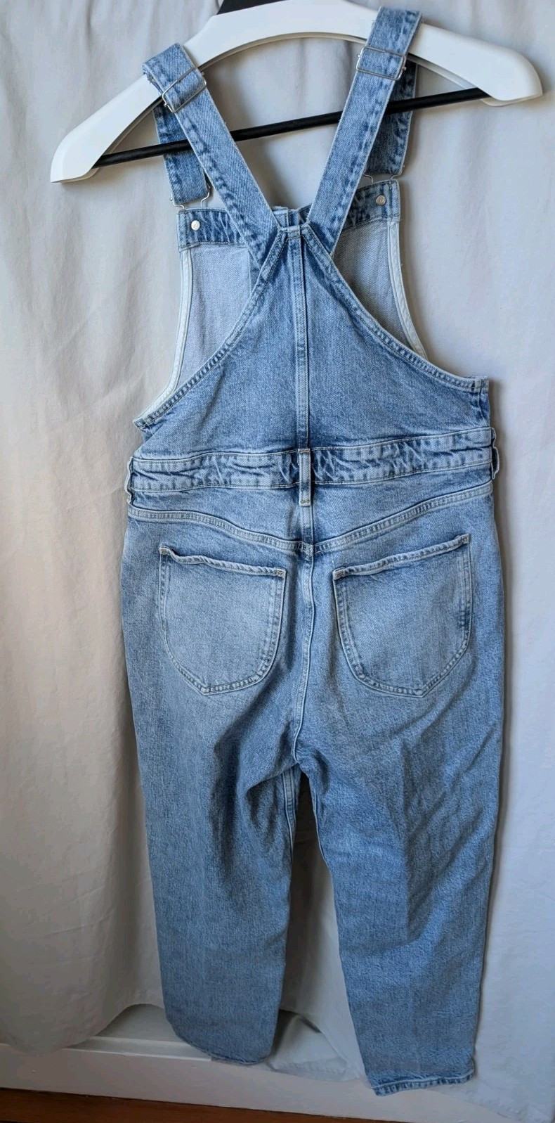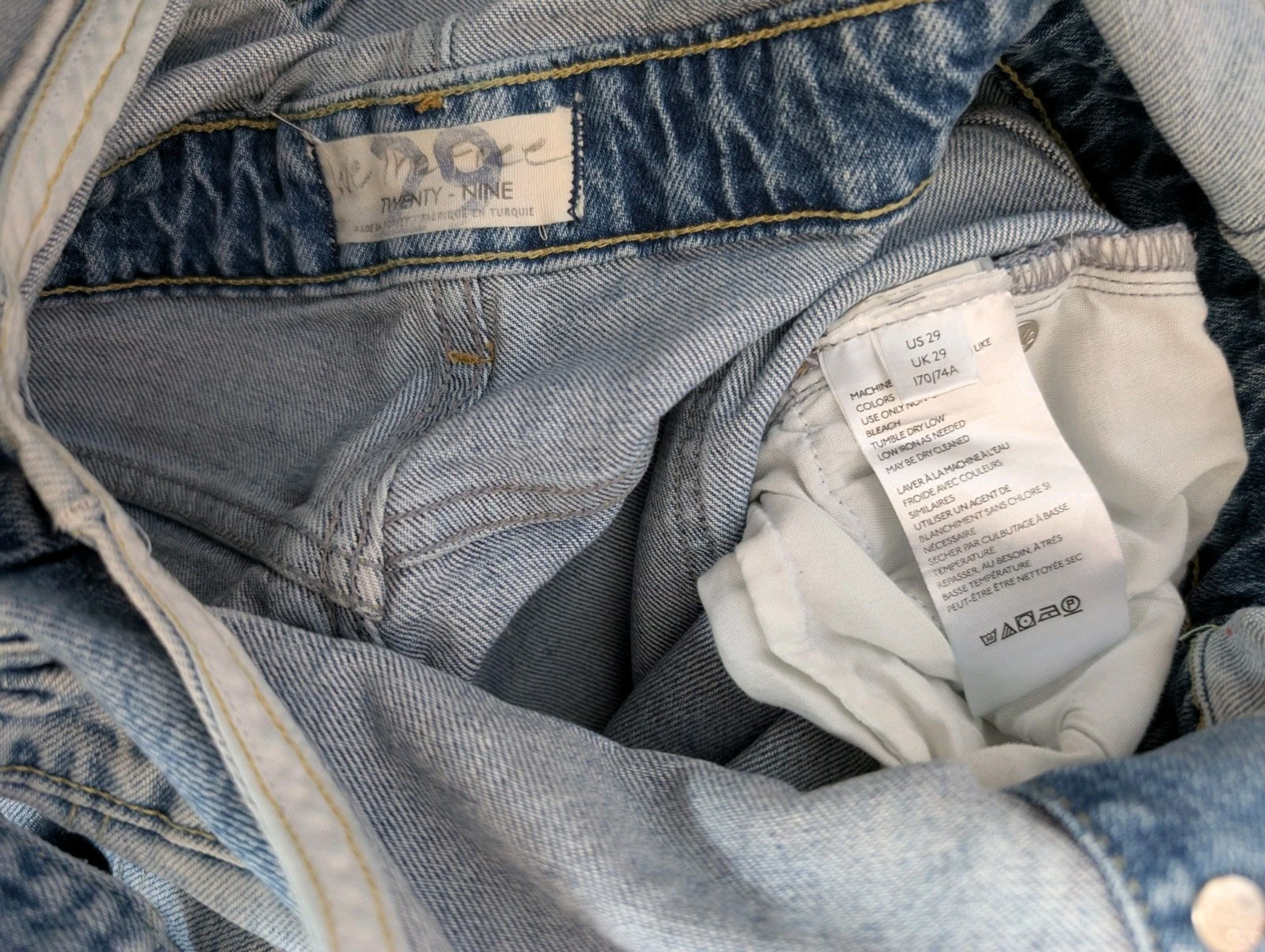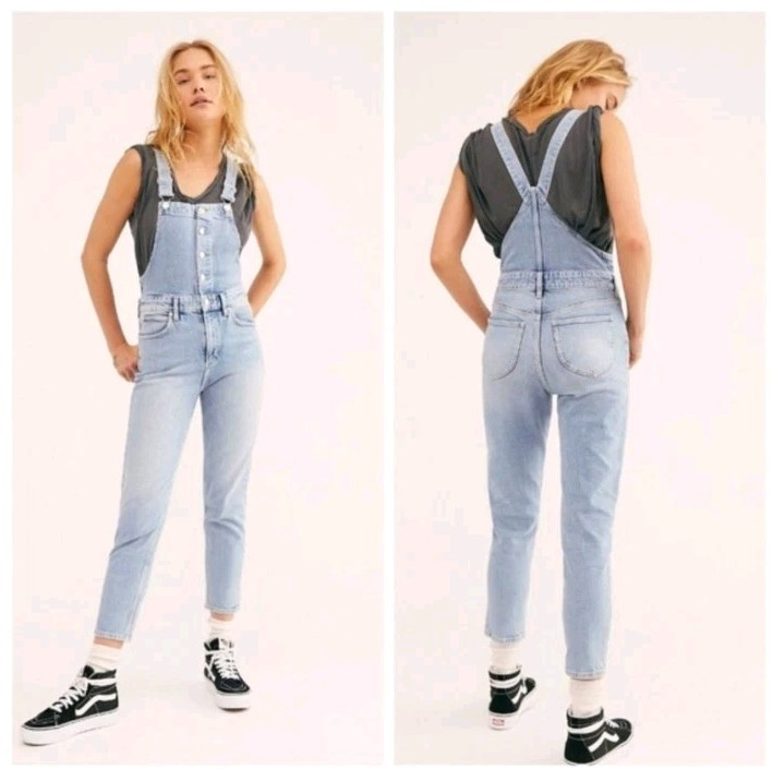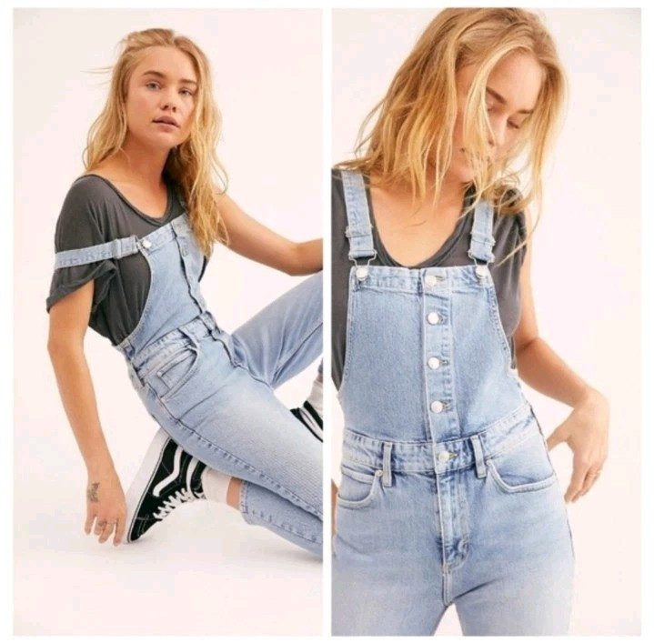 Free People / We the Free Women's size 29 Approximate measurements: 26" inseam 15.5" across waist band 99% cotton, 1% elastane Light fading and distressed detail Front button closure and zip fly Adjustable shoulder straps with buckle closure 5-pocket design Made in Turkey Revolve Style No. FREE-WC82 Manufacturer Style No. OB