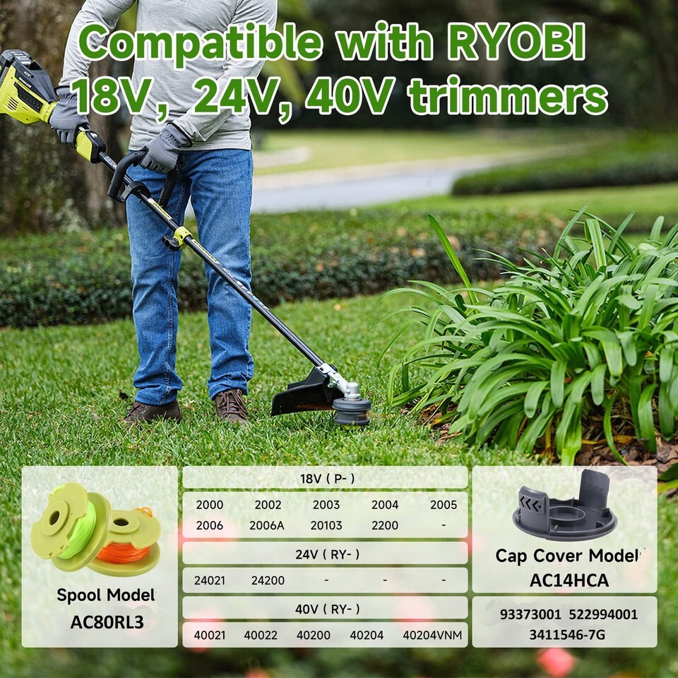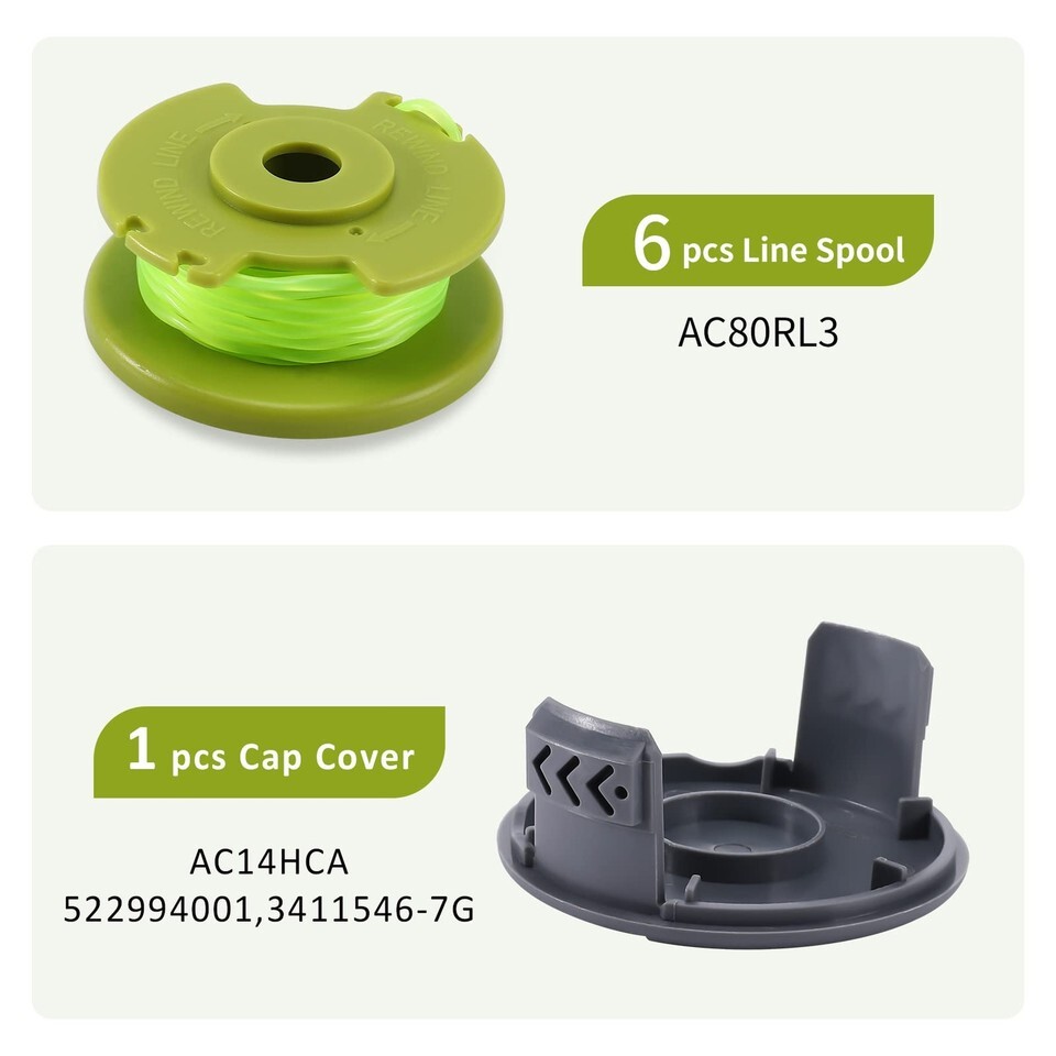 Weed Wacker String Trimmer Twisted Line .080 Inch Spool Replacement for Ryobi 18V 24V 40V - 11 ft long Very limited stock! Order now to avoid disappointment! .080 in Twisted Line Spool #AC80RL3 Replacement Part #AC80RL3. Compatible with RYOBI 18V, 24V, and 40V Cordless Auto-feed String Trimmer/Edger, including Ryobi One Plus+ 18v, 24v, 40v trimmers, Ryobi ZRP2080 One+ 18 Volt, Ryobi 40 Volt, Ryobi 40 Volt RY40204, and Ryobi 40 Volt RY40220. Also compatible with Spool Cap Cover Model: AC14HCA / 3411546-7G / 522994001. High-Quality Materials: Crafted from high-quality raw materials sourced from BASF Germany, ensuring flexibility and superior performance. Efficient Design: Precise spool size and ingenious design make it easy to remove and replace old or empty cartridges from your String Trimmer head. Innovative Twisted Line: .080'' twisted line slices through grass, light brush, and weeds with ease, making mowing more relaxed. Package Includes: Each package includes 6 replacement spools and 1 cap cover, offering excellent value for money. Size: 0.080'' line diameter with 11ft length Shipping The shipping time might be shorter than shown since the estimated delivery dates already include possible delays. We are always working hard to ensure your package arrives as soon as possible. Please understand that some factors like weather, high postal traffic, and the performance of shipping companies are outside of our control. We offer free shipping to the lower 48 states and ship within 3 business days of payment, usually sooner. We do not accept P.O. Boxes. Please provide a physical address. For shipping outside of the continental USA, we only use's Global Shipping Program. The item is shipped to KY and then sent to the rest of the world. International customers are responsible for all duties and taxes. Continue to check out in order to calculate costs for shipping the item to your country. Messages regarding's Global Shipping Program MUST be directed at EXCLUSIVELY.We ship within Three business days of payment, usually sooner. Return We offer a 30-Day Free-Return Policy on items which you are not completely satisfied with. No returns are available on items shipped outside of the USA. Payment We accept payment by veriety of payment methods such as Paypal. Please see the payment options in the checkout. Feedback We try our very best to make sure every customer is completely satisfied. If there's a problem, message us! We're happy to help. Contact Us If you have any queries, please contact us via. We usually respond within 24 hours on weekdays. Please visit our store to check out other items for sale! Thank you for shopping at our store.