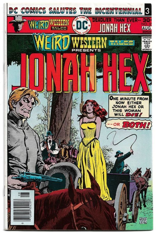 Description: Original cover price: 0.30. Newsstand edition. Bicentennial Cover. Script by Michael Fleisher; Art by George Moliterni; Cover Art by Ernie Chan (as Ernie Chua). Jonah Hex, stranded in the desert after a shootout with the Yellow Mask Gang, is found by Red Eyed Charlie, who warns him that a nearby watering hole is poisoned. They travel to the town of Hall Valley, where they witness the corrupt Marshall Sam Lehman's outrageous hanging of a woman for a minor theft. Hex later observes the Marshall extorting money from local businesses, revealing the man's corrupt nature. 32 pages, Full Color. 112825-112825T