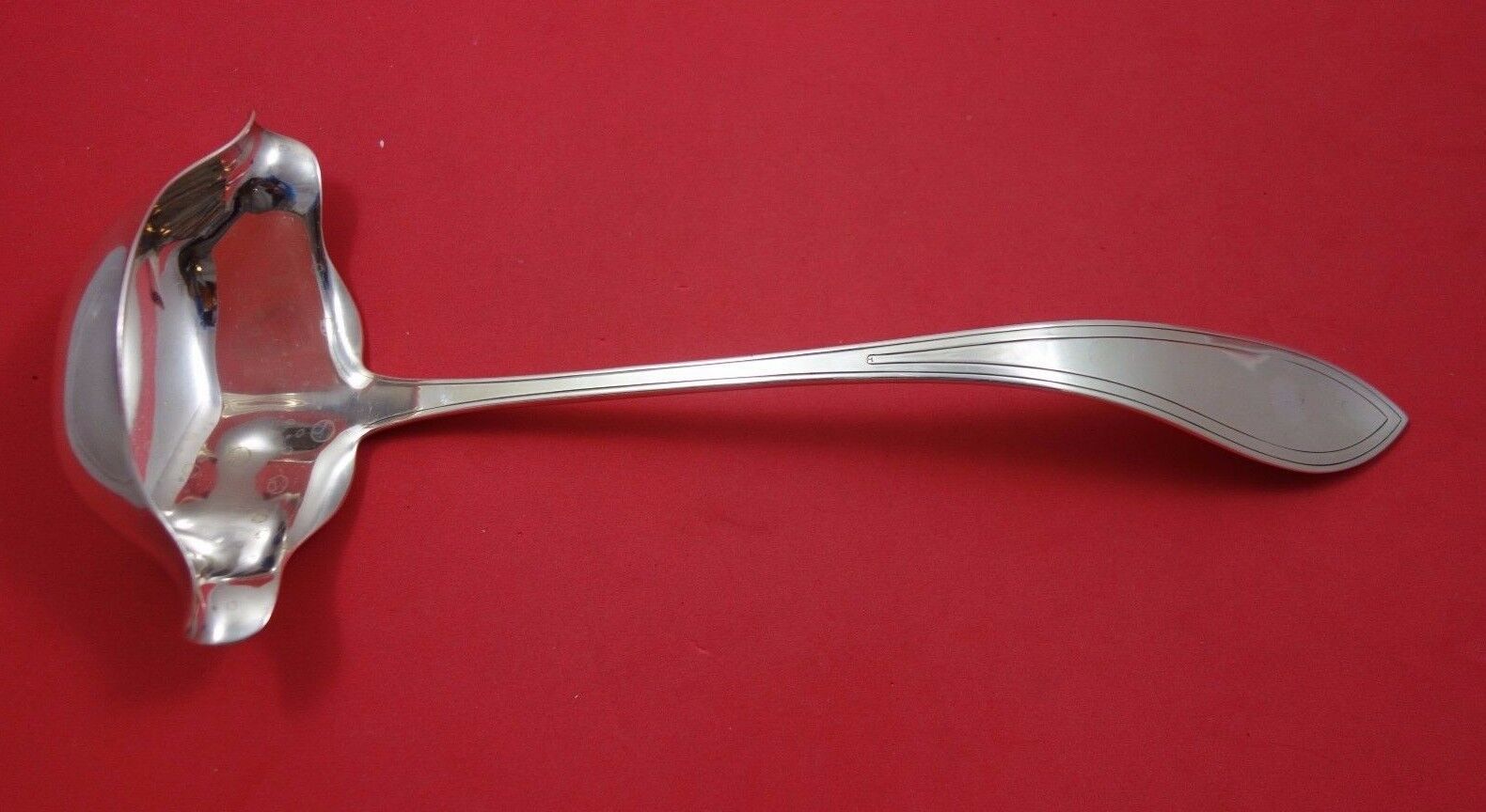 Wentworth by Durgin sterling silver flat handle Punch Ladle All Sterling with Double Spout with Lines, 12". It is not monogrammed and is in excellent condition.