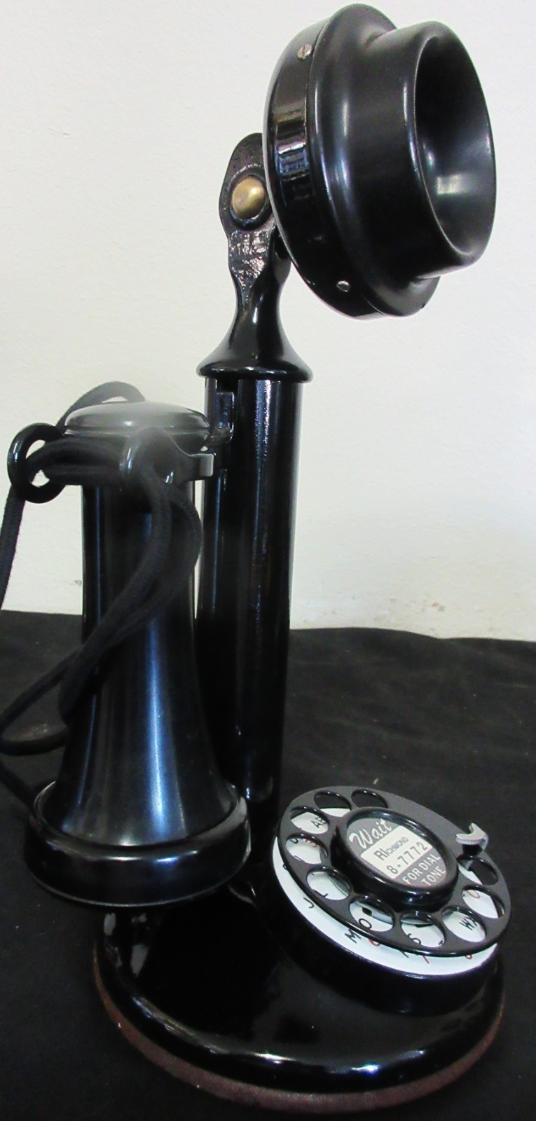 The Western Electric Black Bullnose Candlestick Rotary Dial Telephone Circa 1915 #1 is a vintage collectible telephone from the early 20th century. Manufactured by Western Electric in the United States, this pre-1940 phone features a classic bullnose design with a rotary dial for dialing. A piece of history, this telephone is a rare and sought-after item for collectors of vintage telephones and communication artifacts. An original Western Electric black candlestick telephone with a bullnose mouthpiece, circa 1915. Recently fully restored, and operational. The telephone measures 12" tall by 5.5" in diameter. The phone has cloth covered telephone cords. In excellent condition. Business since 1979