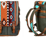 Challenger western backpack made from supple genuine full-grain leather to endure everyday use. Bag comes accented with a unique handwoven saddle rug multiclor pattern. This lightweight versatile bag is ideal for school, work, traveling, weekend trips, daypacking, or the great outdoors. Conveniently sized fits most airline overhead bins for a carry-on option. Includes adjustable padded for comfort shoulder straps. Top full zipper closure main pocket comes fully lined. Inside has one side zippered pocket, two open compartments for organized storage. The antique finish brass hardware beautifully ties the bag together.?