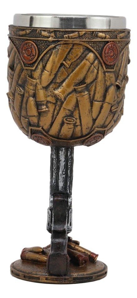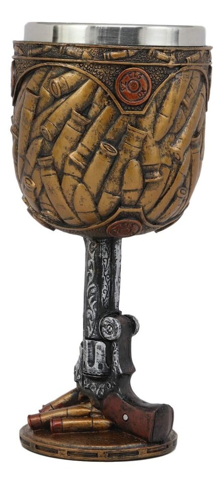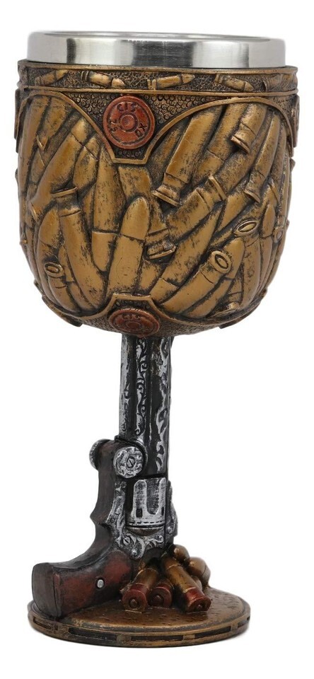 ? This Western Six Shooters With Bullet Shells Wine Goblet is made of high quality resin with stainless steel liner, individually hand painted and polished. Color Tone May vary from pictures.