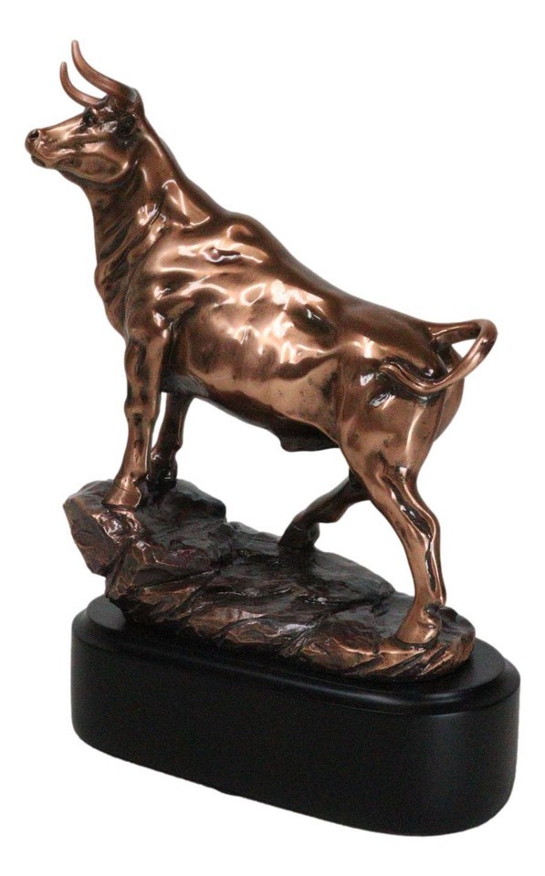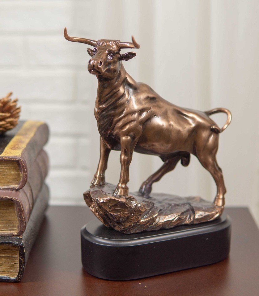 ? Bulls epitomize masculinity in the animal kingdom, symbolizing strength and power in both their physical and spiritual presence. This sculpture features a muscular bull stepping up on a rocky steppe. This 360 degrees, highly detailed sculpture, portrays accurate features of the bull, set on top of a black plastic base.