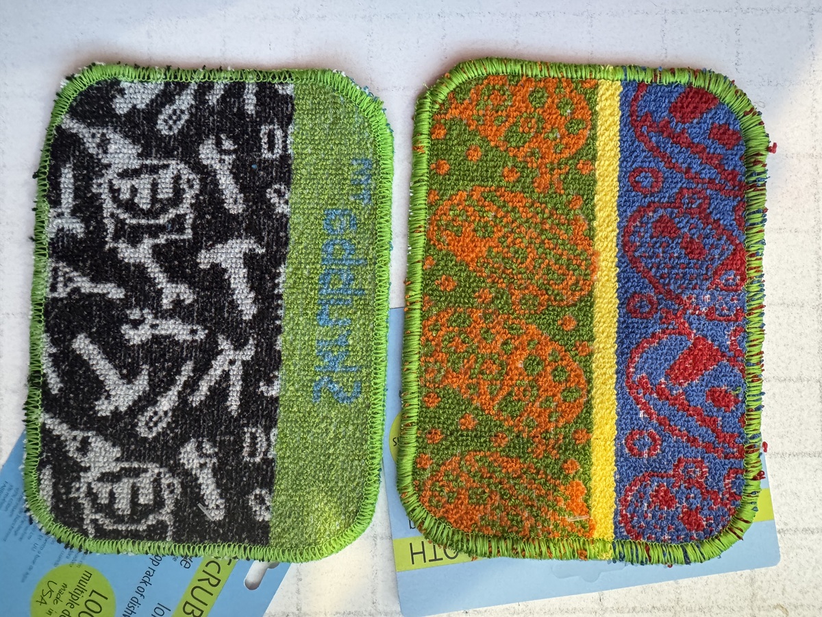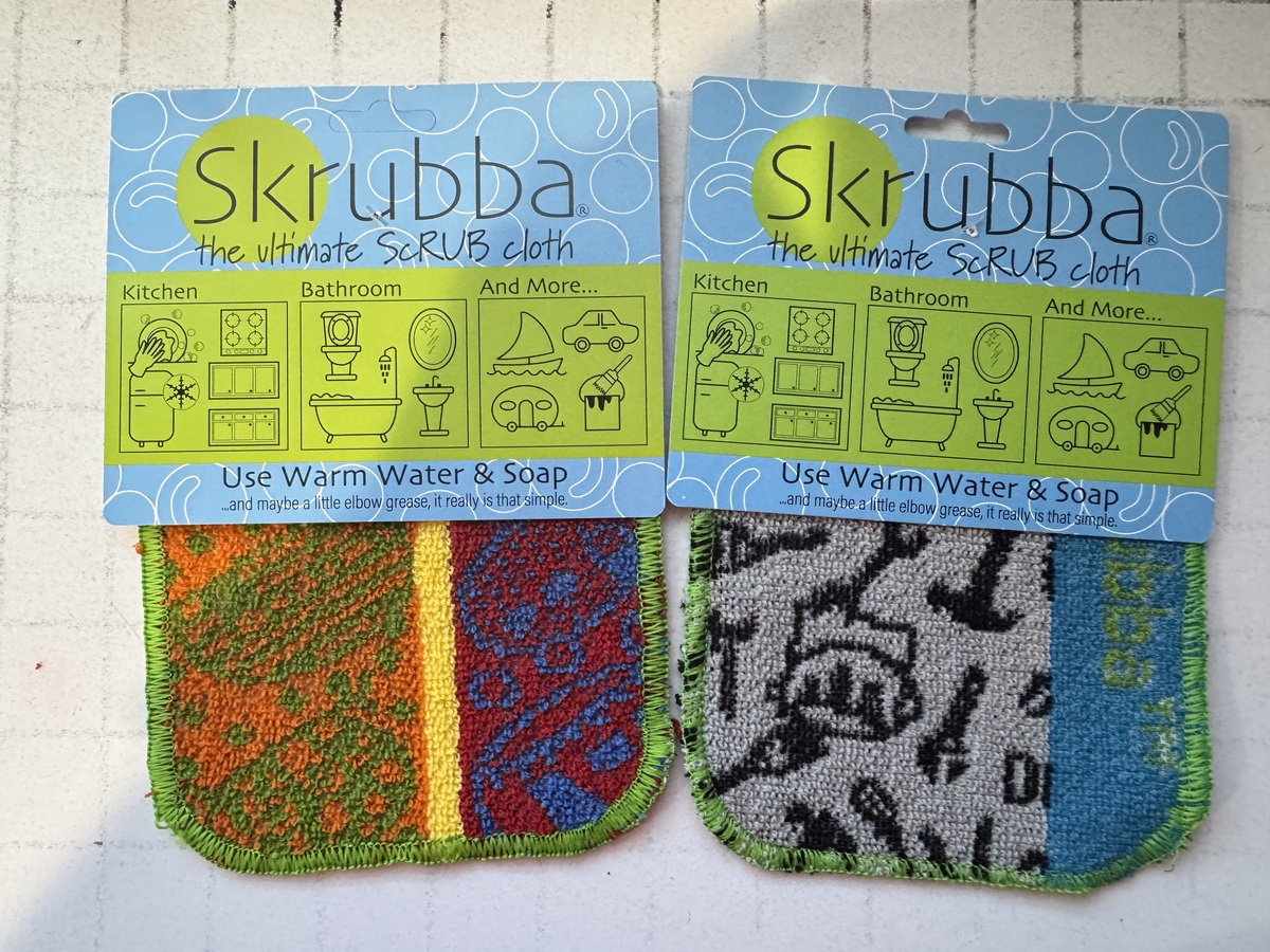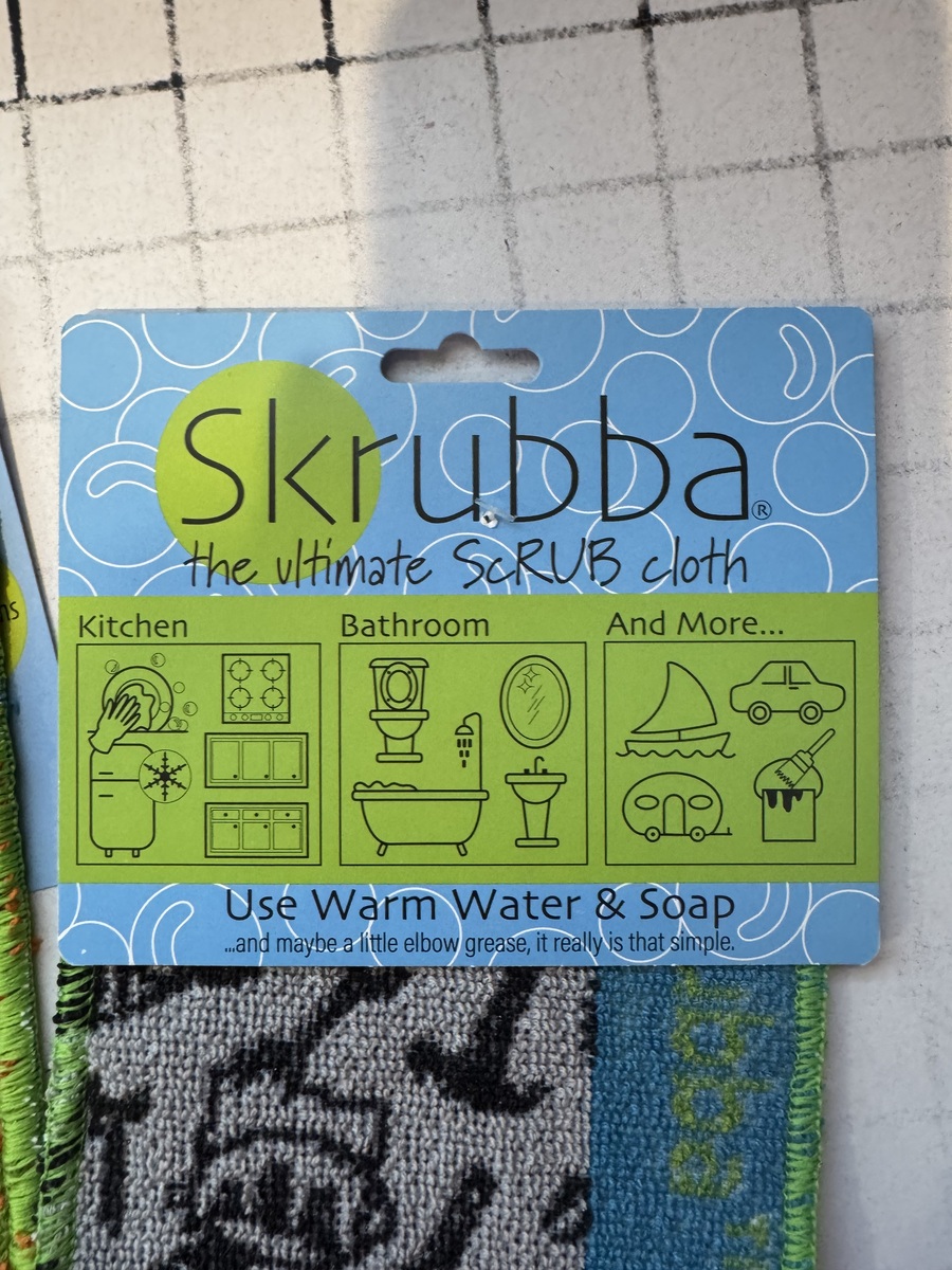 Safe for non-stick pots and pans, microwaves, ceramic-glass, cooktop stoves, granite, stainless steel, tiles, laminate floors, windows, and vinyl siding. Use on your RVs, fiberglass boats, outdoor furniture, pools and liners, and even tar on the exterior of your car surfaces.....without a SCRATCH! Never use toxic chemicals again, just a Skrubba and liquid soap! Important Note: The patterns have a general theme of design but will vary based upon how the product is manufactured. The images provide an idea of the designs incorporated. Manufacturer suggests testing the SKRUBBA on inconspicuous surfaces around the home first to ensure no unintended abrasion; many household surfaces vary in physical and chemical composition. A set of three cotton blend Skrubby's that will NOT SCRATCH most common household surfaces. Made in USA. 94% Cotton, 2% polyester, 4% eco-friendly non-toxic coating. Last 6 months under normal use. Can be cleaned in the dishwasher or washing machine. Color safe with bleaching agent. Safe for non-stick pots and pans, microwaves, ceramic-glass, cooktop stoves, granite, stainless steel, tiles, laminate floors, windows, and vinyl siding. Use on RVs, fiberglass boats, outdoor furniture, pools and liners, and even that road tar on the exterior of your car ... without a SCRATCH! Never use toxic chemicals again, just a Skrubba and liquid soap!