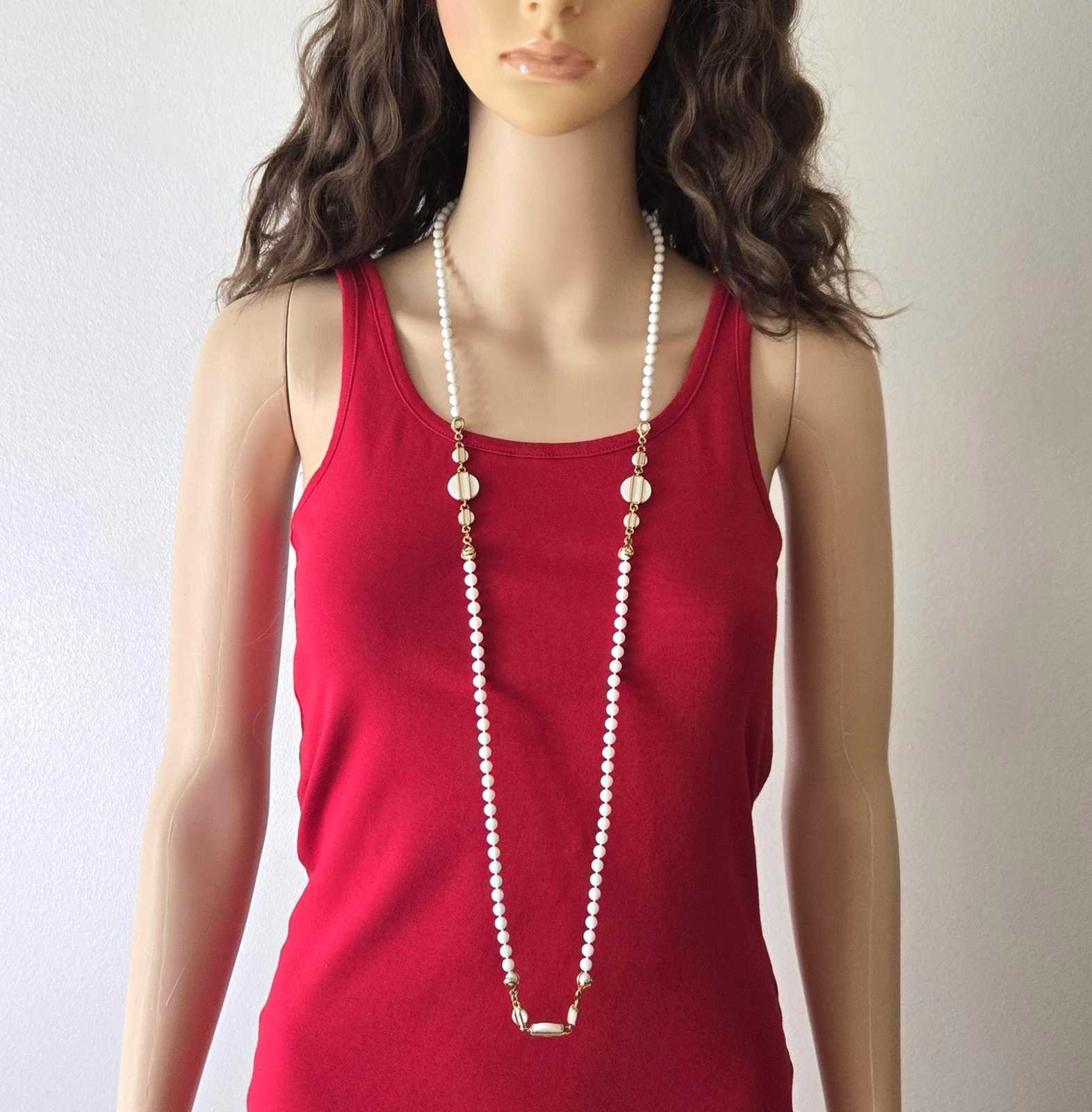 ?Style/Features: Extra long with a clasp for double or triple wrap around or as a chunky choker. Extra long strand with the beads molded directly to the necklace string and attached by links held by unique gold cage caps large disk detail. Extra lightweight for effortless all day choker wear.