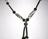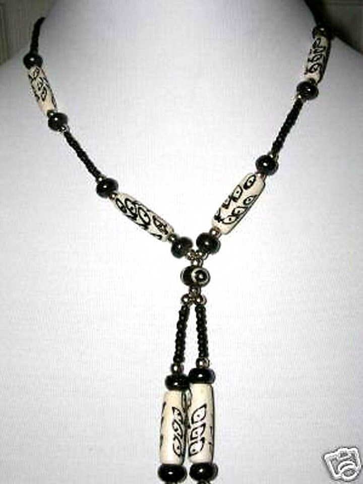 This is a SINGLE STRAND OF 1 INCH ANTIQUED AGED WHITE COLORED BUFFALO BONE BEADS DECORATED WITH LEAVES ROUND SILVER TONE SPACER BEADS BROWN / BLACK BONE BEADS DOUBLE TASSEL DANGLE PENDANT NECKLACE. (Color is hard to see if dark brown or black)