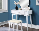 Simple, modern style which fits to a variety of room decors. The set includes the vanity table, mirror, and the matching stool