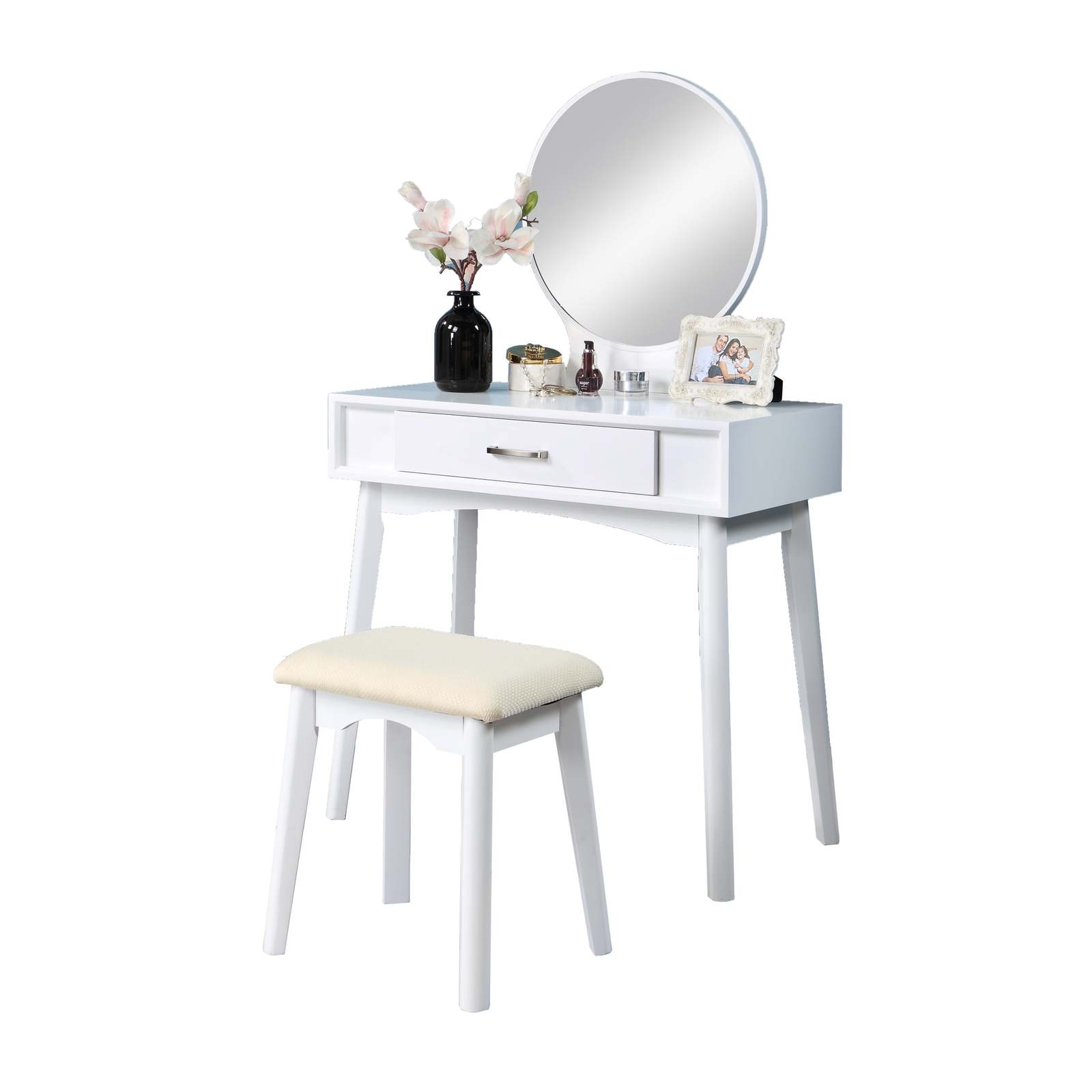 Dimensions: 32.28'W x 16.54'D x 52.75'H. Mirror diameter: 19.7'; Table top dimension: 31.5'W x 15.75'D; Drawer width: 20.57'; Table height: 30.24'; Stool dimension: 16.54'W x 12.6'D x 17.52'H