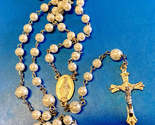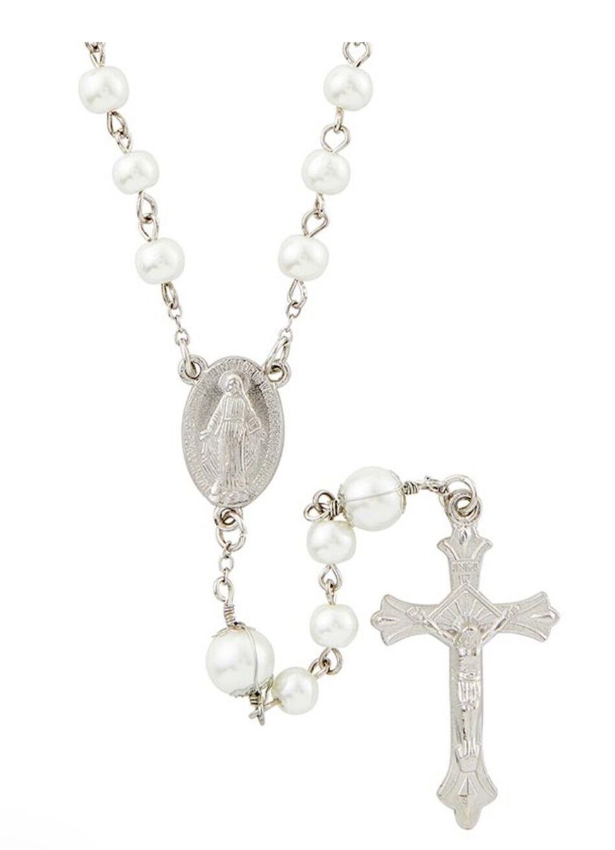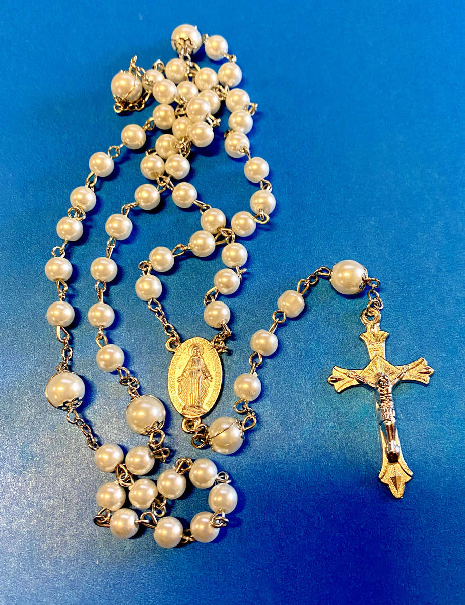 You are purchasing a beautiful mother of pearl faux rosary. Comes with acrylic case ready to be gifted or for you to carry in you purse, pocket, etc. The center is a medal of Our Lady of the Miraculous Medal.