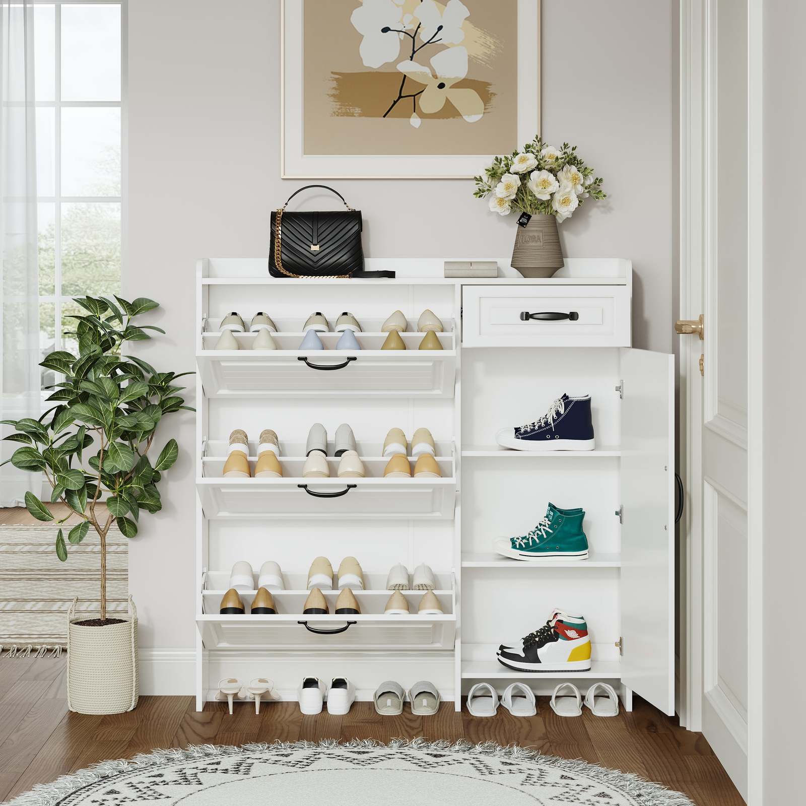 3 flip-drawers of the shoe cabinet provide ample storage space for your shoes.