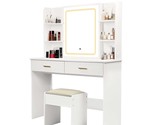 White Vanity Desk with Mirror, LED Lights, Power Outlet & Stool
