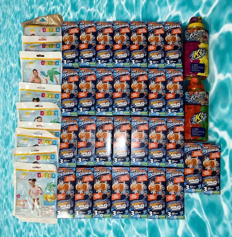 This lot includes bulk items such as children's water floating rings from Intex, Nerf Super Soaker Hydro Balls and a smattering of water balloons. All items are brand new and come with tags.