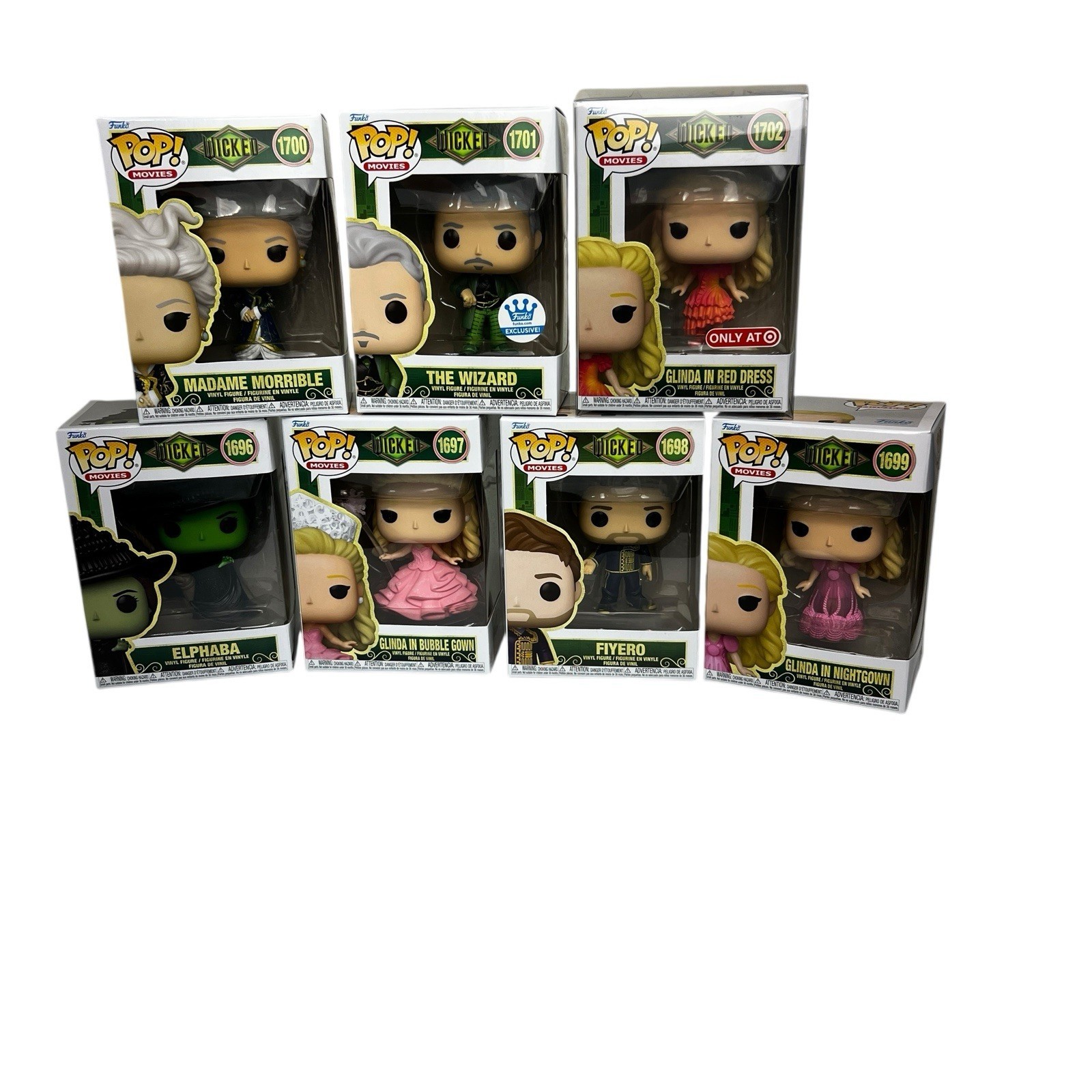 Bring the magic of Oz home with this complete Funko Pop! Wicked collection. This 7-piece set includes Elphaba (#1696), Glinda in Bubble Gown (#1697), Fiyero (#1698), Glinda in Nightgown (#1699), Madame Morrible (#1700), The Wizard (#1701 Funko Exclusive), and Glinda in Red Dress (#1702 Target Exclusive). All Pops are brand new in box (NIB) with excellent window display. Perfect for collectors, Broadway fans, or anyone who loves Wicked. Rare to find as a full set!