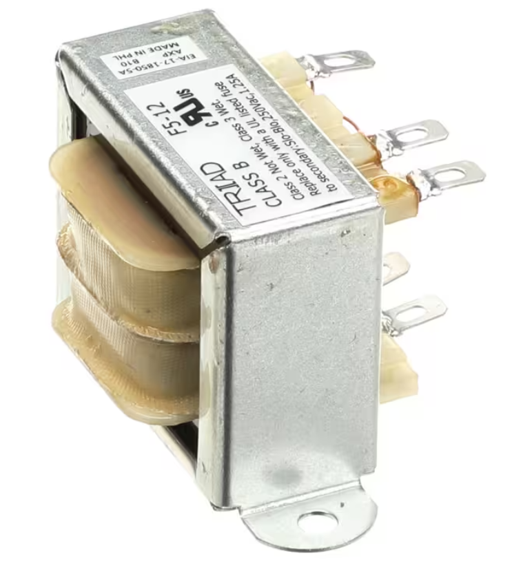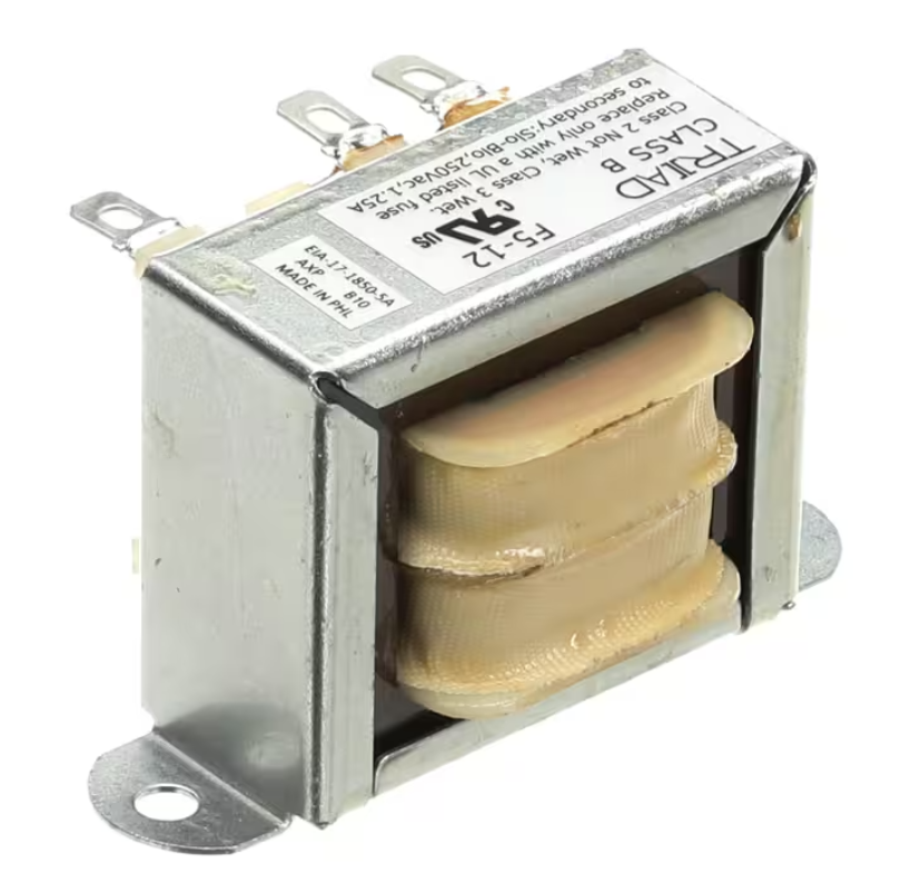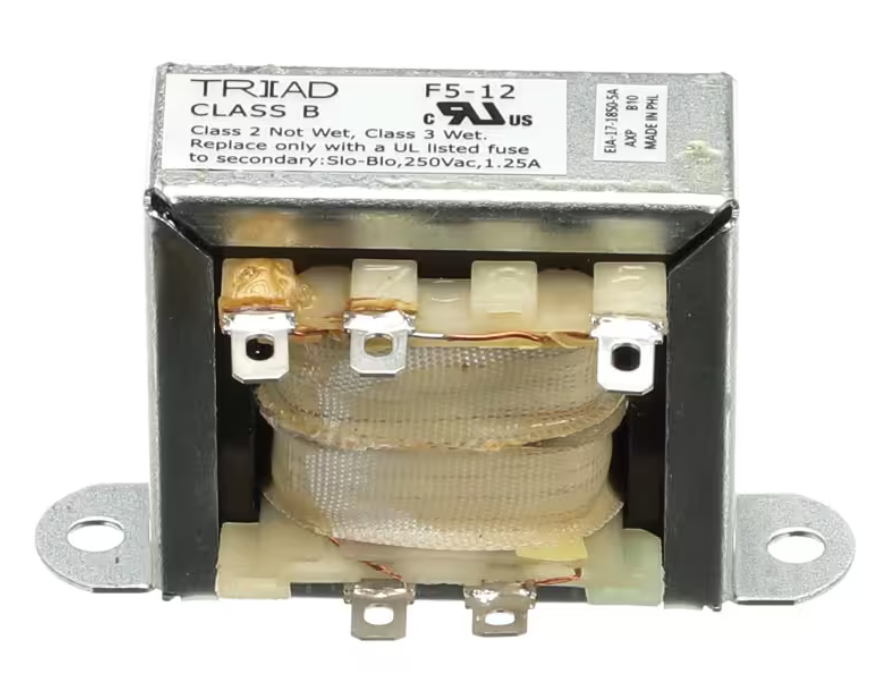 Ensure consistent low-voltage power to your Curtis beverage equipment with this OEM transformer (part numbers F5-12, EIA-17-1850-5A). Designed to convert 120V input to 12V output, this transformer is essential for powering control systems, sensors, and timers in a wide range of Curtis brewers and hot water dispensers. Its compact, durable design guarantees reliable performance in busy commercial drink stations.