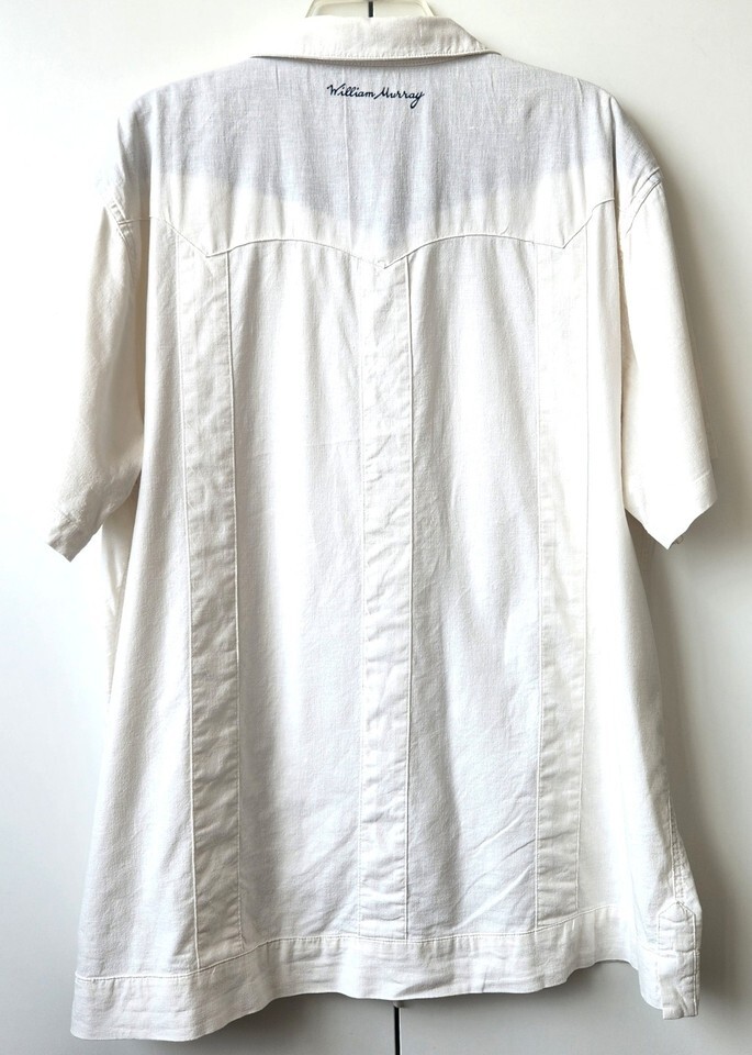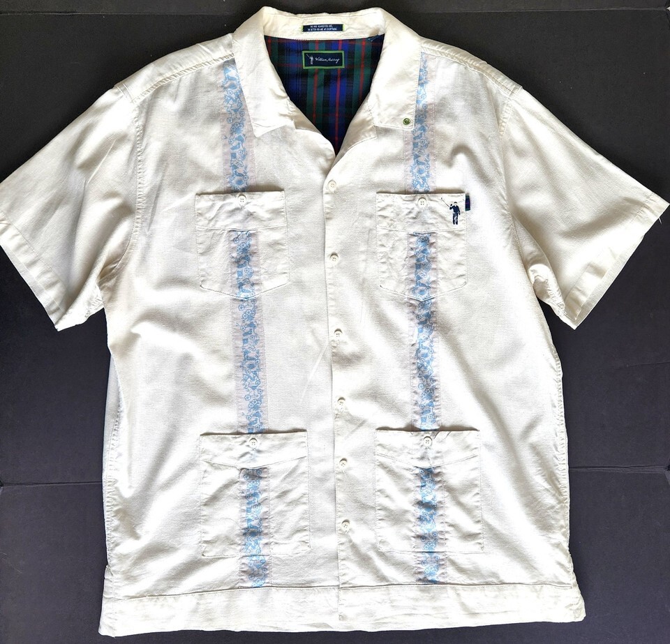 The William Murray Shirt is a stylish and comfortable men's golf shirt in size XL, made from a white linen blend fabric with embroidered Cuban Guayabera detailing. Featuring a solid pattern, short sleeves, button closure, and collared neckline, this shirt is perfect for casual occasions and embodies a golfer character.