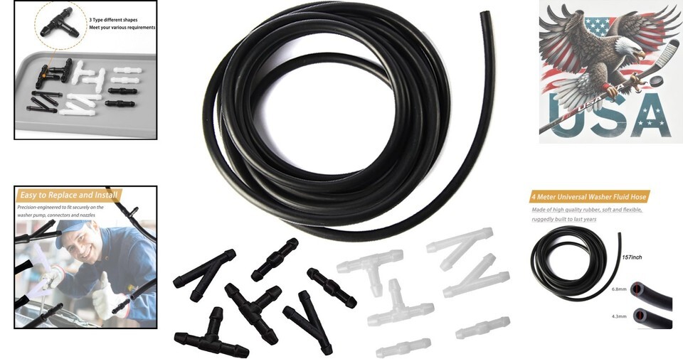 Windshield Washer Hose Kit 4M Universal with 12 Connectors - Compatible with Most Vehicles Nozzles ? ? ? ? ? ? ? ? ? ? ? ? ? ? ? ? Windshield Washer Hose Kit 4M Universal Elevate Your Vehicle's Maintenance This Universal Windshield Washer Hose Kit offers exceptional value and compatibility, making it an essential addition to your automotive toolkit. Designed to effortlessly fit most vehicles, this kit ensures superior functionality and performance. Key Features: Universal Compatibility: Suitable for most windshield washer nozzles, ideal for various makes and models. Complete Set: Includes a robust 400cm (157 inch) windshield washer hose and 12 connectors in T, Y, and I configurations (4 of each type). High-Quality Material: Crafted from rubber that is soft, flexible, and built to withstand the rigors of daily use. Easy Installation: Designed for straightforward replacement and installation, allowing you to restore your washer system with minimal effort. Reliable Performance: Our advanced manufacturing technology ensures fit and function standards to provide dependable service. Why This Kit is Essential: Outdated or damaged windshield washer hoses can impede your ability to maintain clear visibility on the road. Our Windshield Washer Hose Kit takes the hassle out of your maintenance routine, effectively connecting your car?s water pump to the nozzles for a seamless spray and cleaning performance. Enjoy the peace of mind that comes with improved visibility and safety during your journeys. Customer Commitment: At , we are dedicated to delivering top-notch products and services, ensuring your automotive needs are met with convenience and satisfaction. Trust in our rigorous testing and quality assurance to keep your vehicle performing at its best. Order Yours Today! Don?t wait for wear and tear to compromise your driving experience. Equip your vehicle with our reliable Windshield Washer Hose Kit for optimum maintenance and visibility! Shipping Free Fast Shipping - We offer free shipping to most of the USA with a normal delivery time of 3-7 days. However, due to the current situation, additional delivery time (up to 3 weeks) may be required for some items. Alternative Carriers - We may use alternative carriers (e.g. USPS, FedEx, UPS, etc.) to ensure your package arrives safely and on time. Due to the use of multiple carriers, we are unable to provide a tracking number automatically. Handling Time - Orders are processed and shipped within 1-2 business days of receiving cleared payment. Shipping Restrictions - Shipping to Alaska, Hawaii, Puerto Rico, Guam, and other US territories may incur shipping charges or delivery restrictions. Please contact us before ordering, or your order can be refunded/cancelled. State Restrictions - There may be restrictions based on your state of purchase. For example, certain items may not be shipped to California due to state regulations. Contact for Tracking Updates - If you require tracking updates or have any concerns about the delivery of your order, please feel free to contact us, and we will be happy to assist you. Return 30-Day Hassle-Free Returns - We want you to be completely satisfied with your purchase. If you are not, you can return the item within 30 days of receiving it for a full refund or exchange. Easy Return Process - To start a return, simply contact us and we will provide you with a prepaid return shipping label and detailed instructions. Restocking Fee - There are no restocking fees for returns. However, the buyer is responsible for return shipping costs if the return is not due to a seller's error. Refund Processing Time - Refunds will be processed within 5 business days of receiving the returned item in its condition. Payment We accept all major credit cards, PayPal, and Apple Pay for your convenience. Your payment information is secure and encrypted to ensure a safe and seamless transaction. Please complete your payment within 3 days of purchase to avoid any delays in shipping. Feedback Your feedback is extremely important to us. We strive to provide the best products and customer service possible. If you are satisfied with your purchase, please take a moment to leave us a positive review. If you have any concerns or issues with your order, please contact us before leaving negative feedback. We are committed to resolving any problems and ensuring your satisfaction. Contact Us If you have any questions or concerns, please feel free to out to our customer support team. You can contact us through the messaging system. We are available Monday to Friday, 9:00 am to 5:00 pm EST, and we will do our best to respond to your inquiry within 24 hours. Buy it now and enjoy a pleasant shopping experience! Item Height: 0.1 Centimeters Item Length: 157 Inches Item Weight: 0.14 Kilograms Material: Rubber