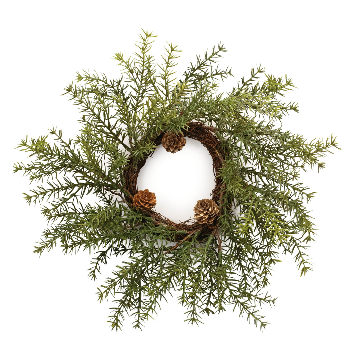 Bring the beauty of the outdoors into your home with the Winter Pine Wreath. This charming wreath features earthy green and brown tones with natural pinecones and a rustic grapevine twig base, adding depth and versatility to your seasonal decor. The wired branches make shaping and styling a breeze, allowing you to customize each wreath to your liking. Sold in a set of two, these wreaths are the perfect size to be used as candle rings on a tabletop, or hang them together to create a welcoming display on your entryway doors or fireplace mantle. The understated beauty of the wreaths will enhance any holiday setting, adding a touch of nature to your home. Measures 14 inches across when branches are extended and fluffed.
