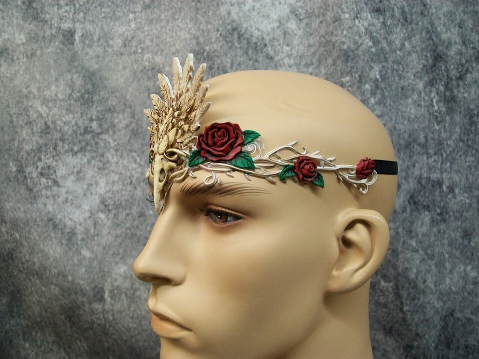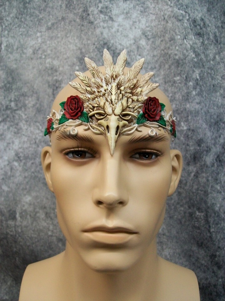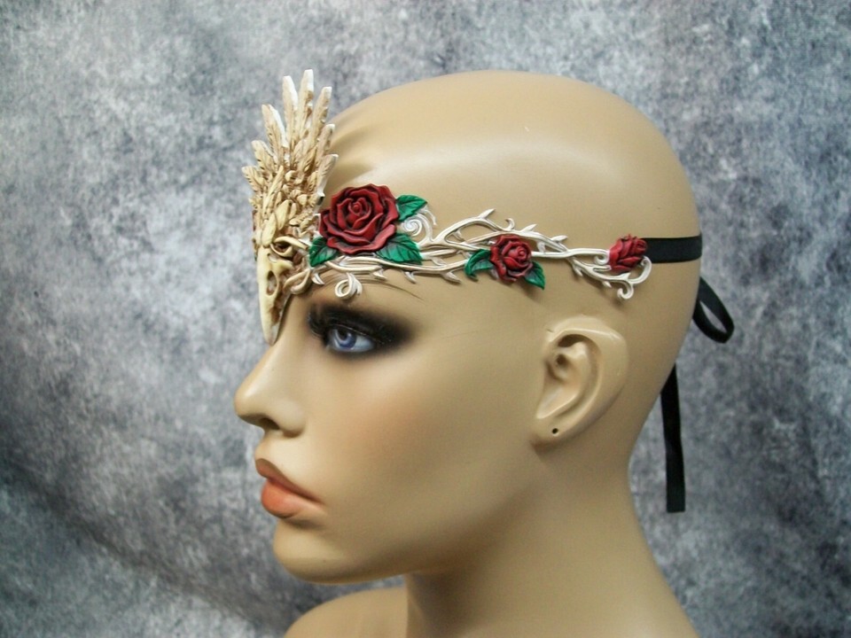 Gothic Witch Doctor / VooDoo Costume Headband. Flexible Vinyl like material with black ribbon ties. Visible Excess paint on the backside. Only the front side is finished. The sides look a bit fragile. Use care with tying the ribbons and be sure to not pull too tightly to prevent damage or breakage to the headpiece. Could be used with costumes such as listed below: Unisex. One Size Fits Most. Not intended for use by children 12 or younger.