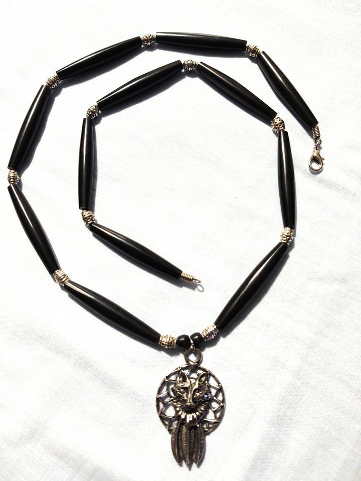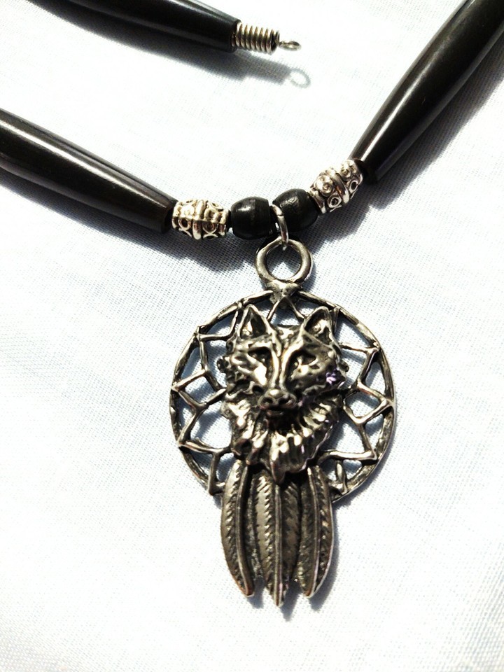 - WOLF HEAD DREAM CATCHER ON BLACK BUFFALO BONE HAIR PIPE BEADS 28" NECKLACE