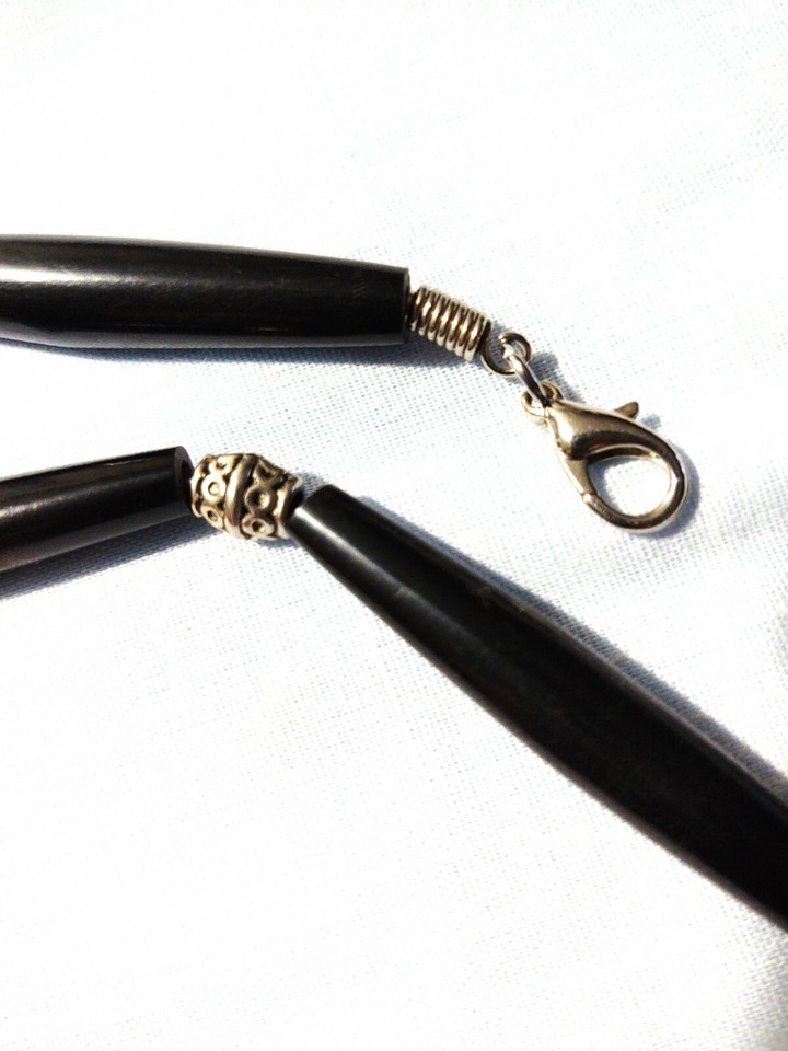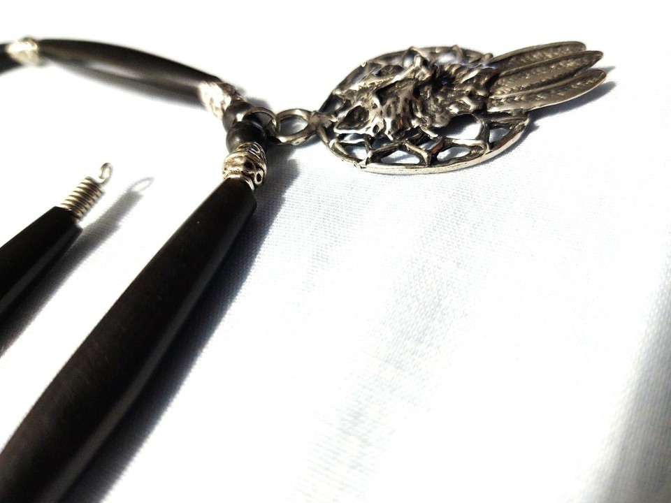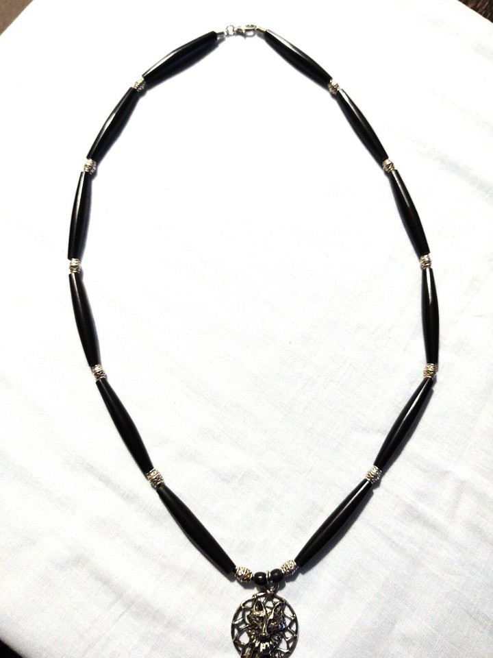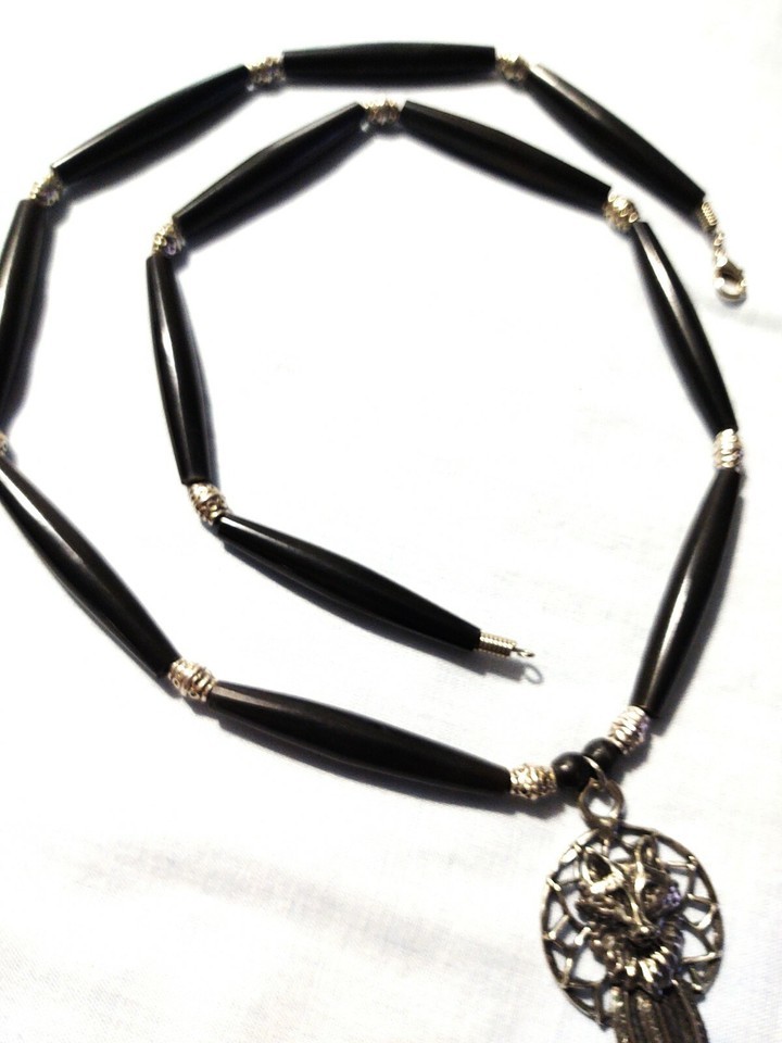 It is made of DYED BLACK BUFFALO BONE HAIR PIPE BEADS - 2 INCHES LONG EACH DESIGNED BARREL SPACERS A SOLID PEWTER WOLF FACE DREAM CATCHER WITH FEATHERS PENDANT THE PENDANT IS HAND CAST USA SILVER PEWTER - NICKEL LEAD FREE.
