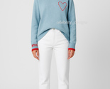Wrap yourself in luxurious softness with this 100% cashmere sweater, designed for style and comfort. Featuring a flattering asymmetrical hemline, this sweater is adorned with charming, embroidered details, including a stitched heart and script accents. Contrasting red cuffs add a bold and modern touch, making it a standout piece for any wardrobe.