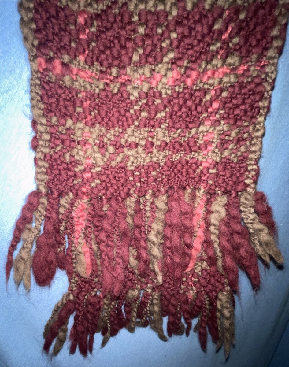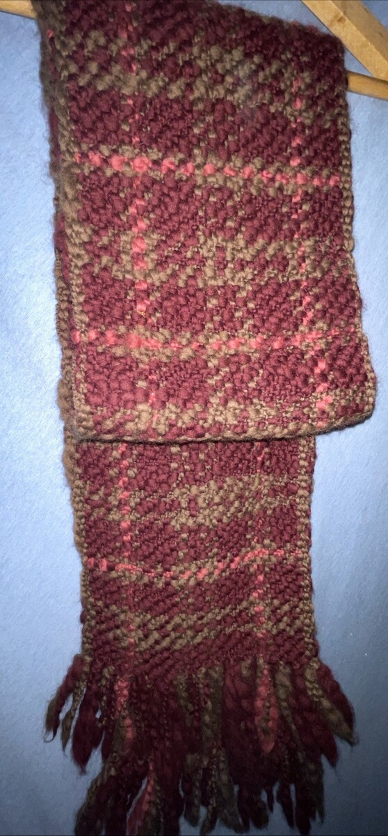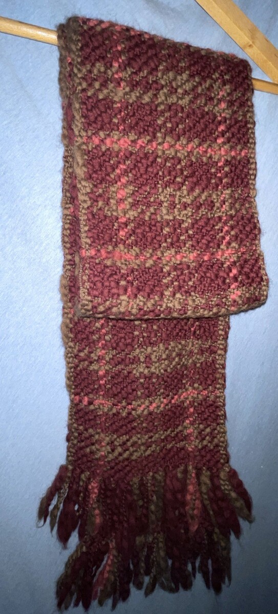 This Women's Banana Republic 100% Wool Burgundy/Dark Pink Scarf is a lovely and warm accessory perfect for chilly weather. The scarf features a striped pattern in a deep burgundy color with fringe accents, making it a stylish addition to any outfit. Made from high-quality wool, it provides extra warmth during the winter, fall, and spring seasons. The rectangle style and neck warmer feature make it comfortable to wear while keeping you cozy and stylish. Measurements in inches Length 65 Width 7 Fringe 3 Smoke free and clean seller