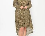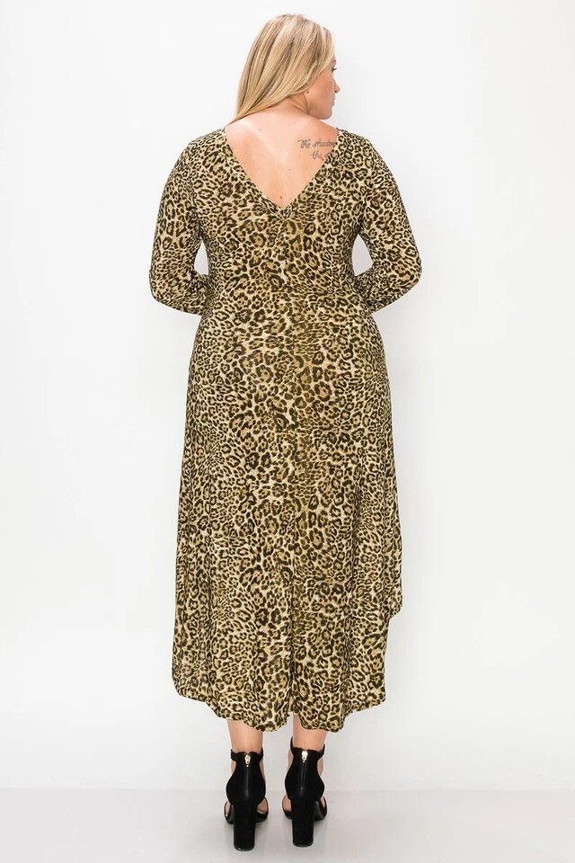 Cheetah print dress featuring a round neck, a flattering V line back, long sleeves, and a high-low hem.