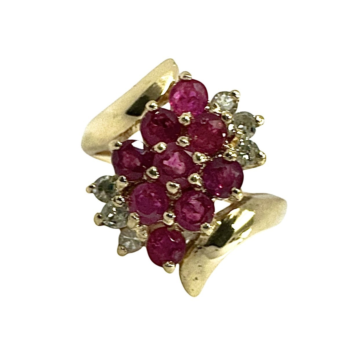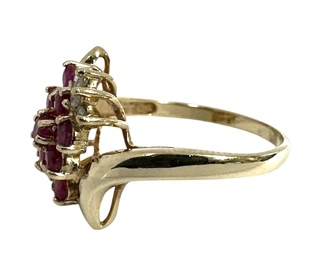 Type: Cluster ringWeight: 1.7Karat: 10ktMetal: Yellow GoldGender: Women'sStyle: ClusterSize / Length: 5.5Owner applied: 10kStone 1 quantity: 9Stone 1 shape: RoundStone 1 color: PinkStone 1 weight (total): .27Stone 2 Quantity: 6Stone 2 Shape: RoundStone 2 Color: ClearStone 2 Weight (Total): .12Stone 2 Type: DiamondCondition:Used