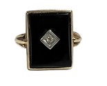 Type: Cluster ringWeight: 3.0Karat: 14ktMetal: Yellow GoldGender: Women'sStyle: FancySize / Length: 7.5"Owner applied: 14K HRHStone 1 quantity: 1Stone 1 shape: OtherStone 1 color: BlackStone 1 weight (total): 1.25Stone 1 type: OnyxStone 2 Quantity: 1Stone 2 Shape: RoundStone 2 Color: ClearStone 2 Weight (Total): .01Stone 2 Type: DiamondCondition:Used