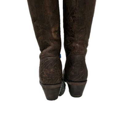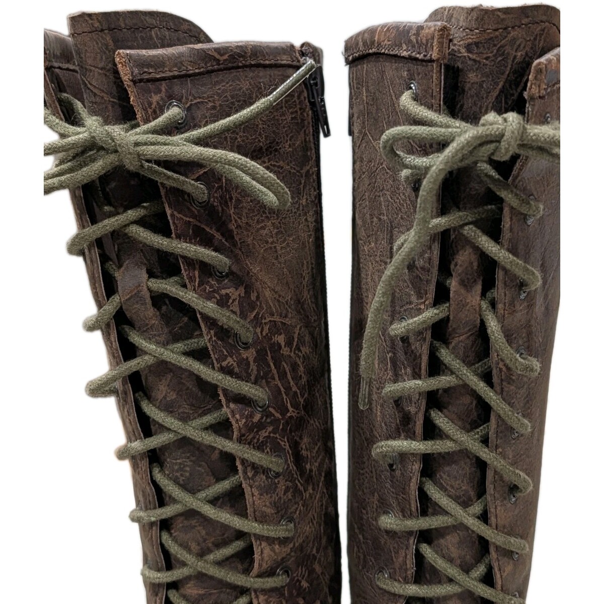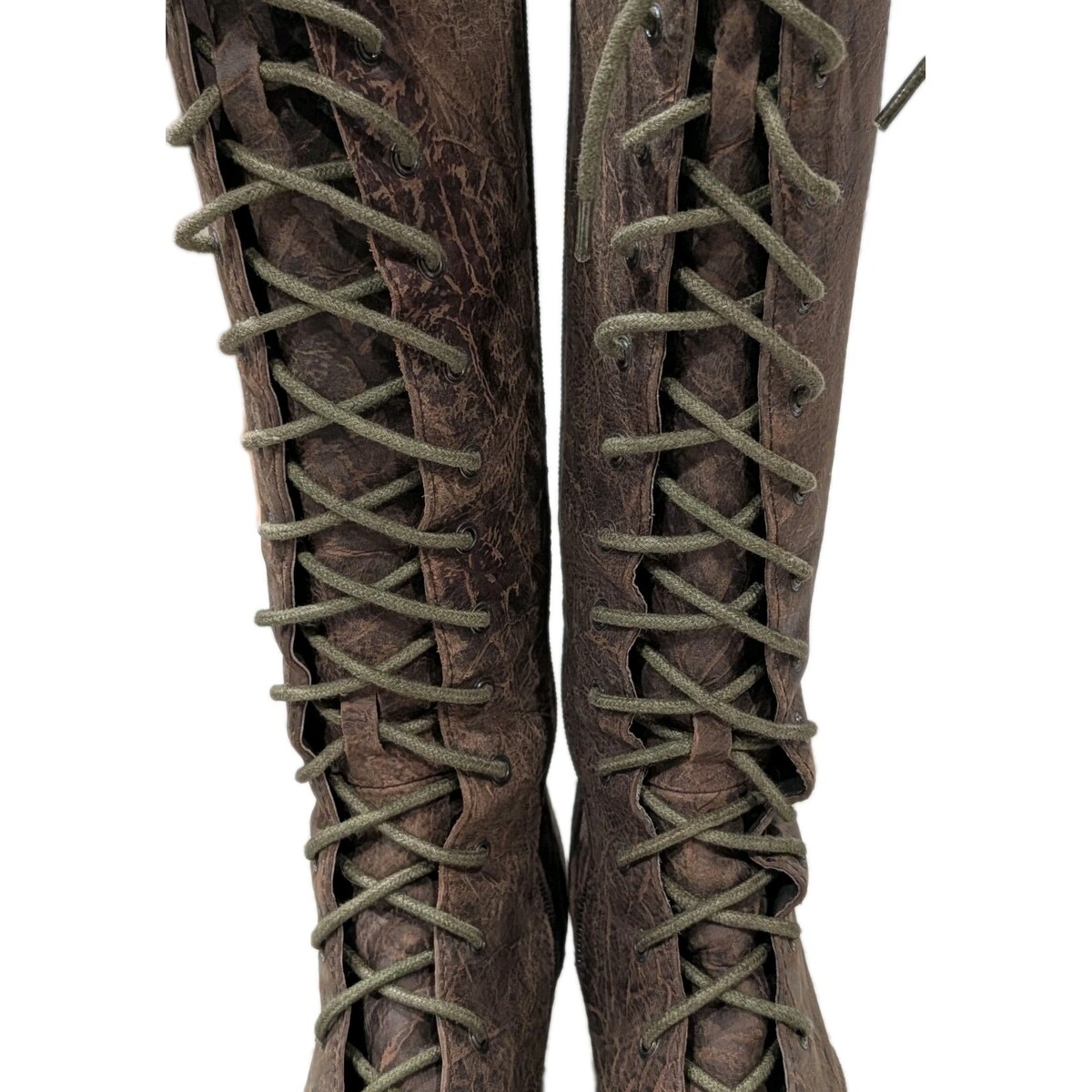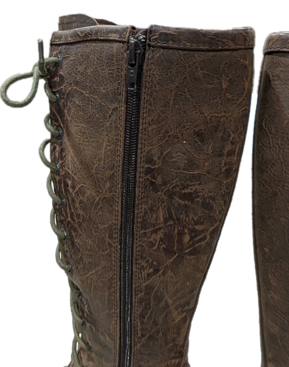 These boots boots lace up the front and have an approximately 14-in shaft. Heel is about 2 and 1/2 in high. Brown crushed leather look. These boots are in mint condition! Absolutely stunning!