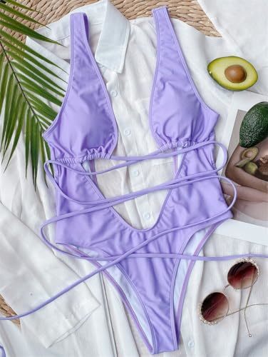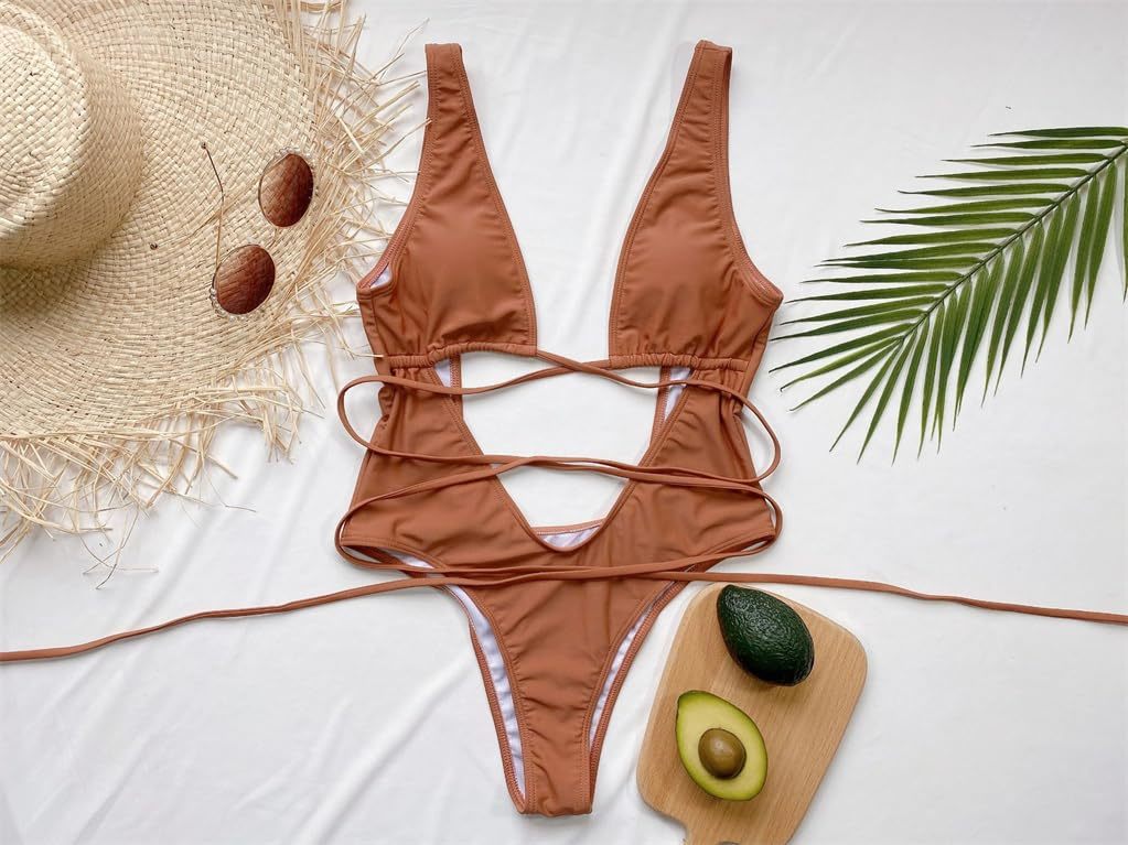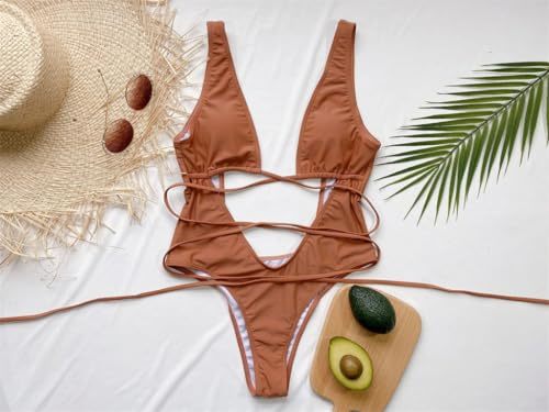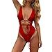 - Women's Deep V-Neck One Piece Swimsuit, Red Hollow Out Monokini Swimwear, Strapp
